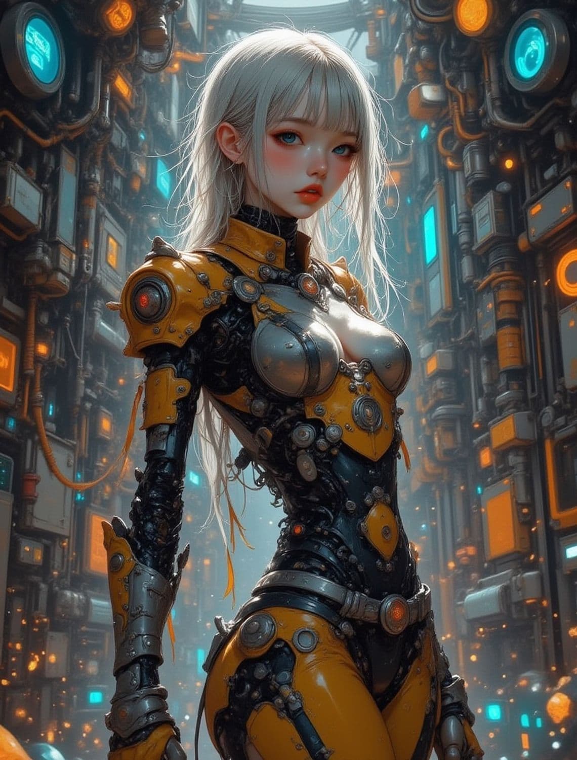 A futuristic female android with long white hair stands in a high-tech corridor. She wears a sleek, armored suit in shades of black and yellow, adorned with intricate mechanical elements and glowing accents. Her expression is calm and composed, and the background features complex machinery with orange and blue lights.