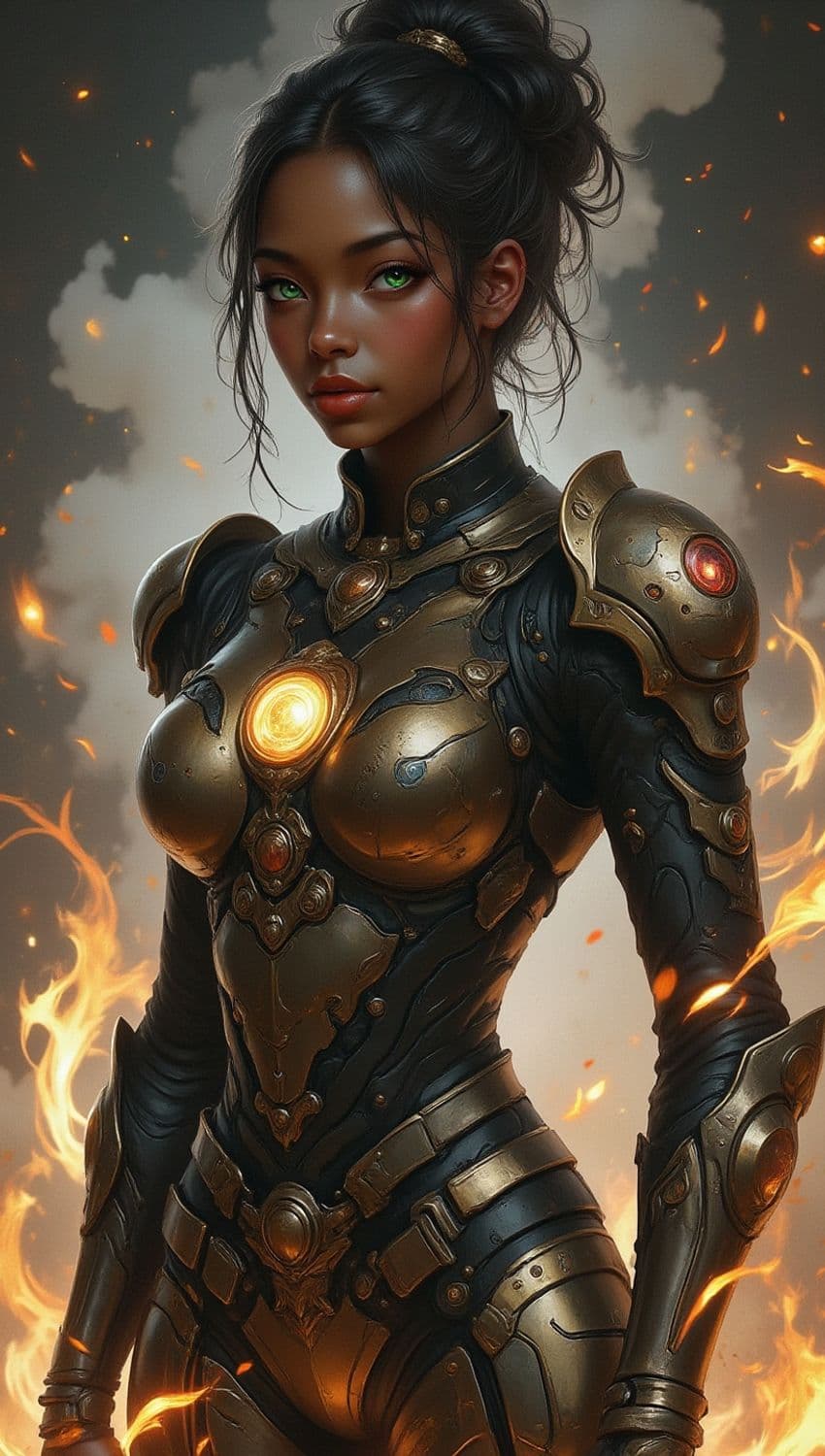 A futuristic warrior woman stands confidently amidst swirling flames and smoke. She wears a highly detailed, golden-ornate armor with glowing elements. Her hair is tied in a high, messy bun, and her vivid green eyes bring a striking contrast to the fiery background.