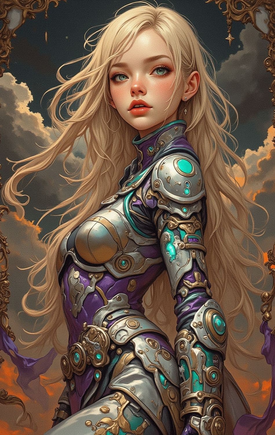 A majestic figure clad in intricate armor, blending shades of silver, purple, and turquoise. The figure's long, flowing blonde hair cascades down their shoulders, set against a dramatic, cloud-filled sky. The armor features ornate details and glowing elements, suggesting technology or magic.