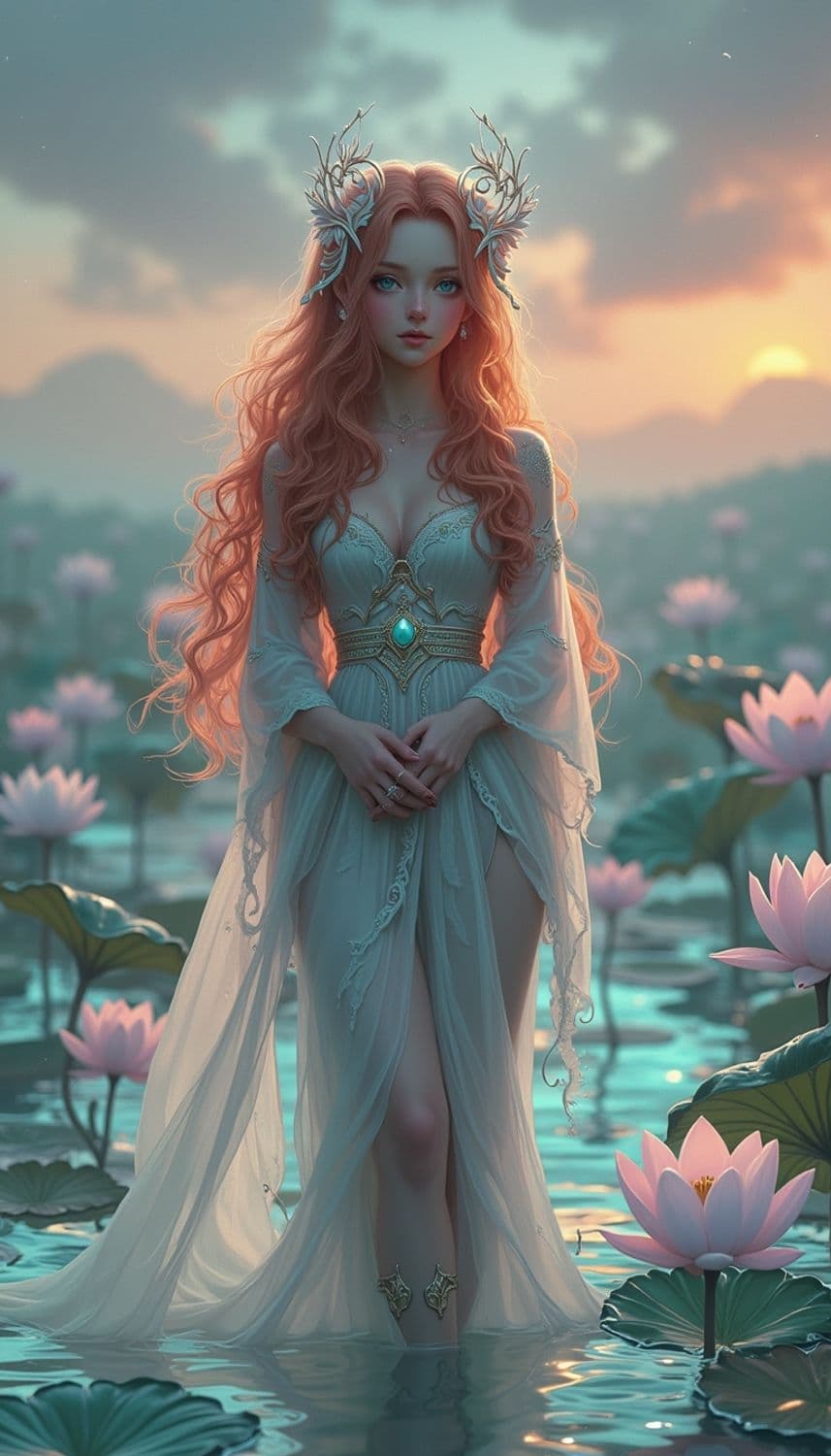 In a mystical, ethereal realm of floating, luminescent lily pads under a sky painted with the colors of a serene sunset, a captivating female figure stands poised on a shimmering, translucent water platform. Her attire is a flowing robe crafted from a fabric that seems to capture the essence of sunset reflections, blending shades of soft peach and shimmering teal. Her hair, a striking shade of sunset auburn, cascades down her back in intricate, flowing waves, framing a face with delicate, serene features. Her eyes, a mesmerizing shade of tranquil turquoise, seem to reflect the mysteries of the water's depth. She wears a delicate crown made of intertwining water lilies and tiny, luminescent pearls, enhancing her celestial and otherworldly presence. The background is a breathtaking scene of luminescent lily pads and gentle, glowing streams of light that weave through the realm, creating a serene and enchanting atmosphere. The style is a blend of fantasy and water elegance, with a focus on vibrant color tones and intricate detailing, creating a mesmerizing and otherworldly atmosphere.