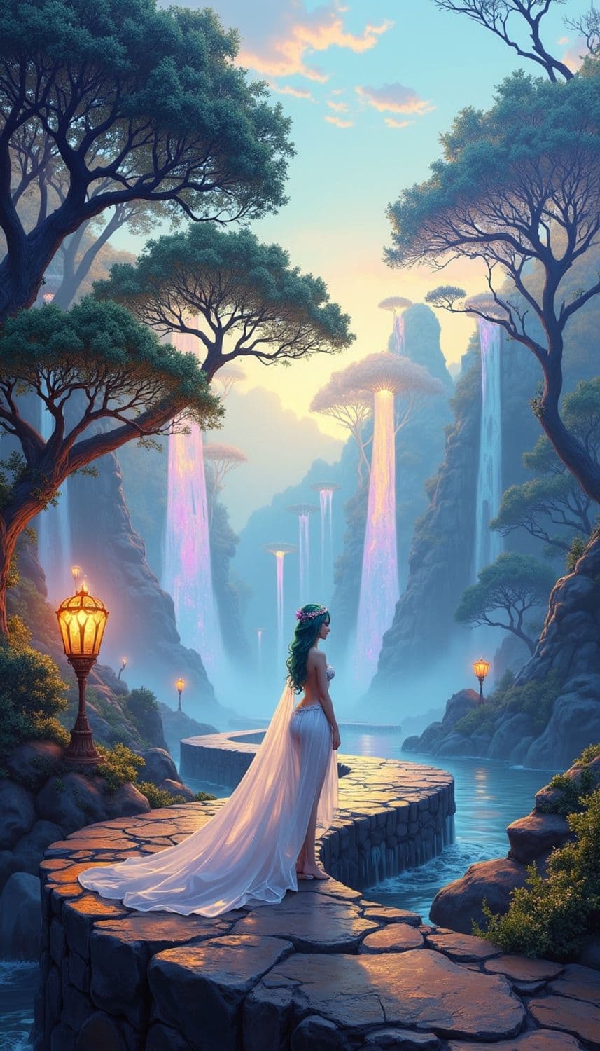 In a mystical, ethereal realm of floating, luminescent waterfalls cascading through a vibrant forest under a sky painted with the colors of a serene dusk, a captivating female figure stands poised on a shimmering, translucent stone bridge. Her attire is a flowing gown crafted from a fabric that seems to capture the essence of twilight mist, blending shades of deep forest green and shimmering silver. Her hair, a striking shade of twilight teal, cascades down her back in intricate, flowing braids, framing a face with delicate, serene features. Her eyes, a mesmerizing shade of forest emerald, seem to reflect the mysteries of the enchanted woods. She wears a delicate crown made of intertwining silver vines and tiny, luminescent emeralds, enhancing her celestial and otherworldly presence. The background is a breathtaking scene of luminescent waterfalls and gentle, glowing streams that weave through the forest, creating a serene and enchanting atmosphere. The style is a blend of fantasy and forest elegance, with a focus on cool color tones and intricate detailing, creating a mesmerizing and otherworldly atmosphere.