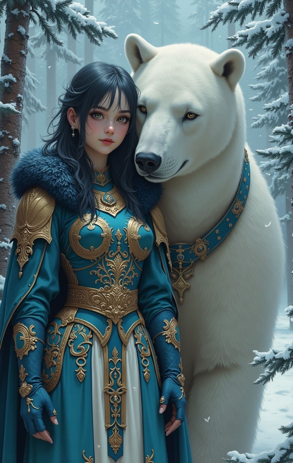 A young woman stands confidently in a snow-covered forest alongside a majestic polar bear. She wears an elaborately decorated teal and gold armor with intricate patterns and a luxurious fur collar. Her dark hair frames her delicate features, and she exudes an aura of strength and grace. The polar bear stands close, wearing a matching teal and gold harness adorned with ornate embellishments.