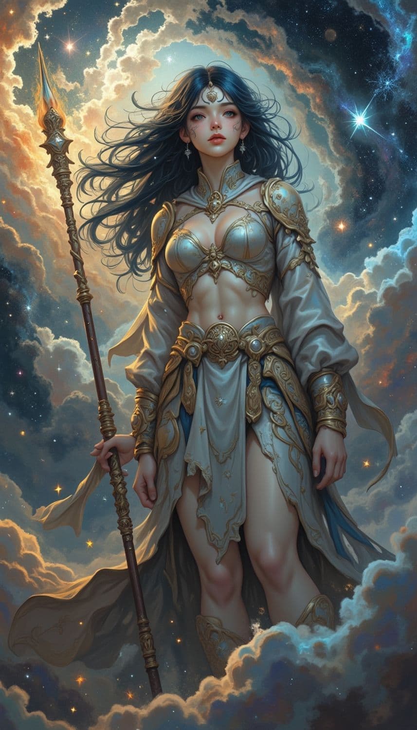A mystical female warrior stands amidst a celestial background of clouds and stars. She wears ornate golden armor with a flowing cape and holds a staff with a glowing tip. Her dark hair flows freely, complementing the ethereal setting.