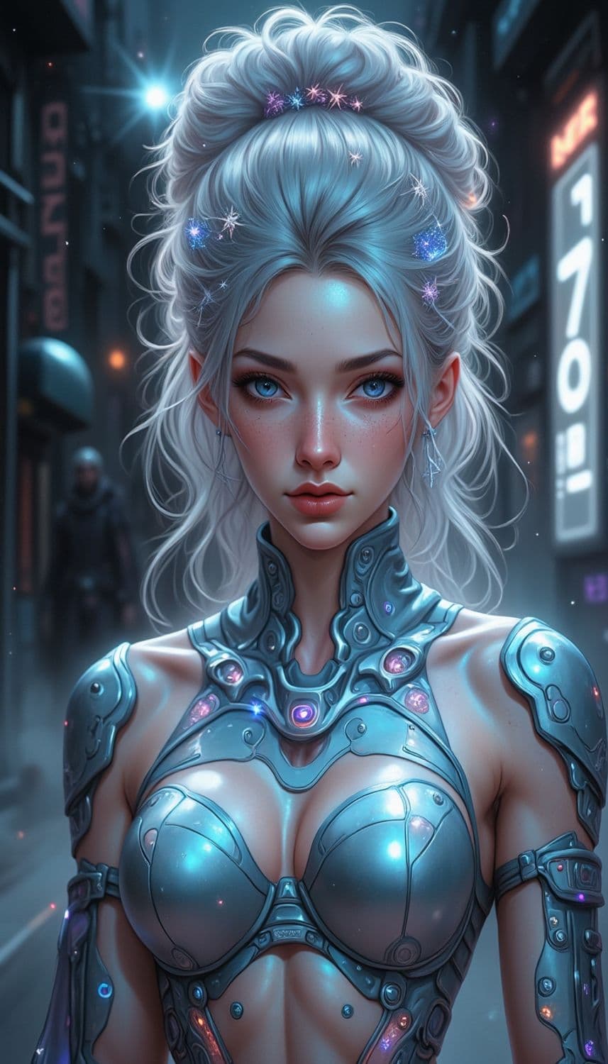 A futuristic female character stands in a dimly lit, cyberpunk-style alley. She has striking, icy blue eyes and silvery hair adorned with sparkling ornaments. Her attire is a form-fitting, metallic armor with glowing accents, hinting at advanced technology. The background is a blurred cityscape with neon signs, contributing to the sci-fi ambiance.