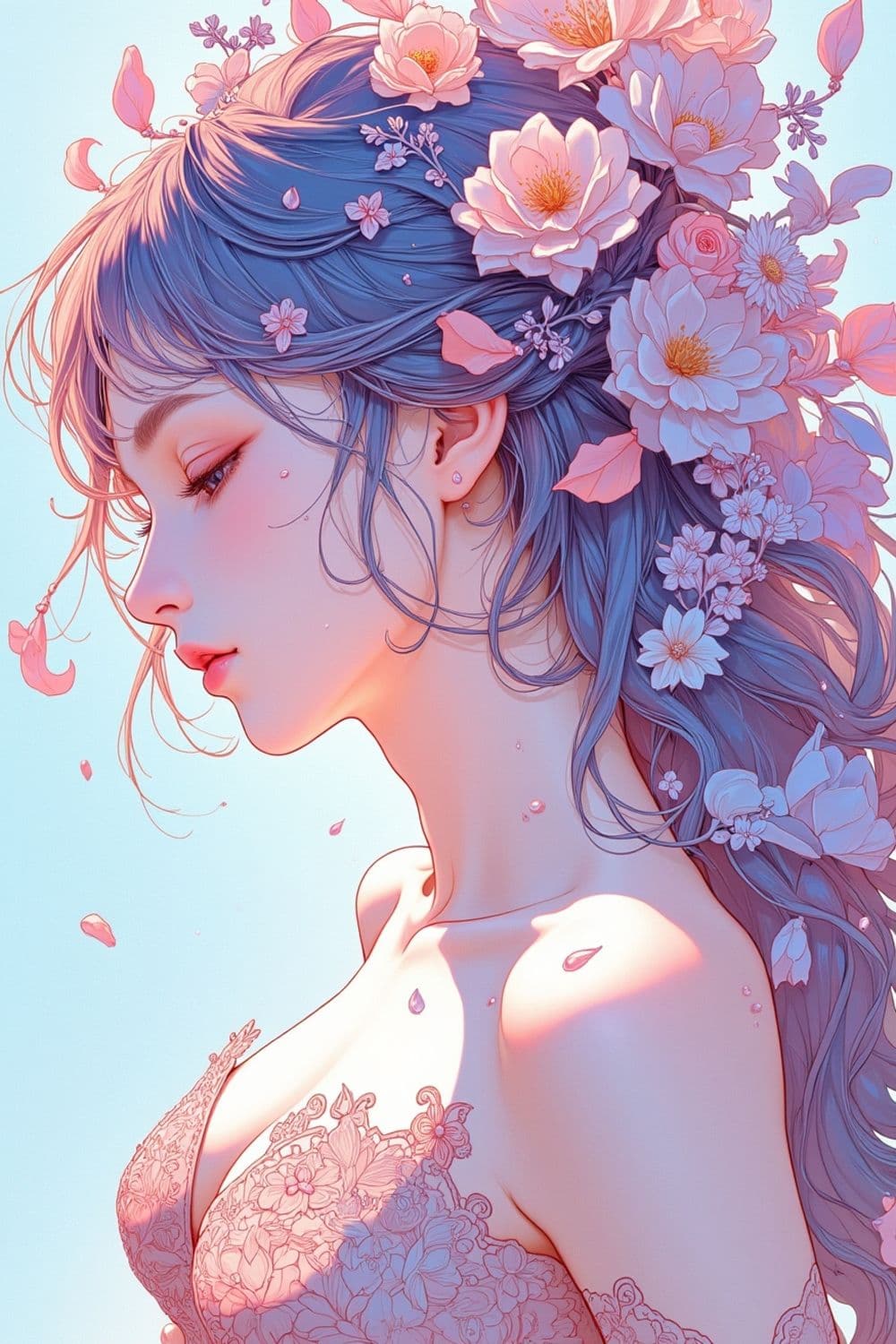 A serene and elegant digital illustration of a woman with long, flowing hair adorned with various flowers. Her profile view reveals delicate features and a calm expression as she gazes downward. The soft pastel colors of pink, blue, and white add a whimsical and gentle atmosphere, while petals float around her. She wears a floral-patterned dress that complements the blossoms in her hair.
