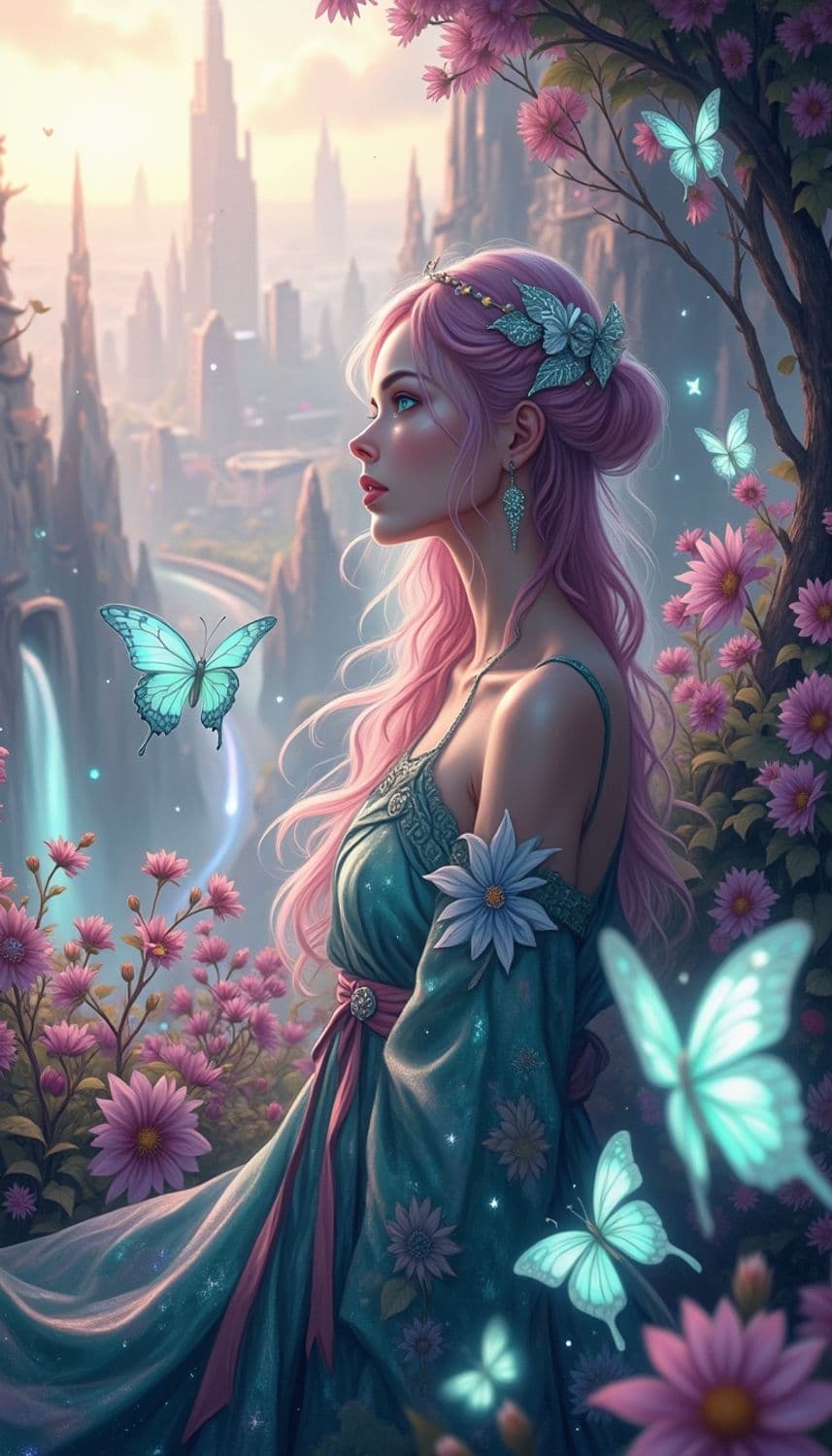 In a futuristic, ethereal garden suspended high above a sprawling city, a captivating female figure stands amidst a sea of bioluminescent flowers and floating, holographic butterflies. Her attire is an elegant, flowing gown crafted from a shimmering, reflective fabric that captures the vibrant hues of the garden, blending shades of emerald green and luminescent silver. Her hair, a striking shade of neon pink, is styled in an intricate, braided crown that frames a face with delicate, otherworldly features. Her eyes, a mesmerizing shade of holographic turquoise, seem to reflect the vibrant energy of the garden. She wears a delicate headpiece adorned with tiny, floating orbs of light that pulse gently around her, enhancing her futuristic and enchanting presence. The background is a breathtaking scene of towering, crystalline structures and gentle, glowing streams that weave through the garden, creating a serene and enchanting atmosphere. The style is a fusion of sci-fi and fantasy elegance, with a focus on vibrant color tones and intricate detailing, creating a mesmerizing and otherworldly atmosphere.