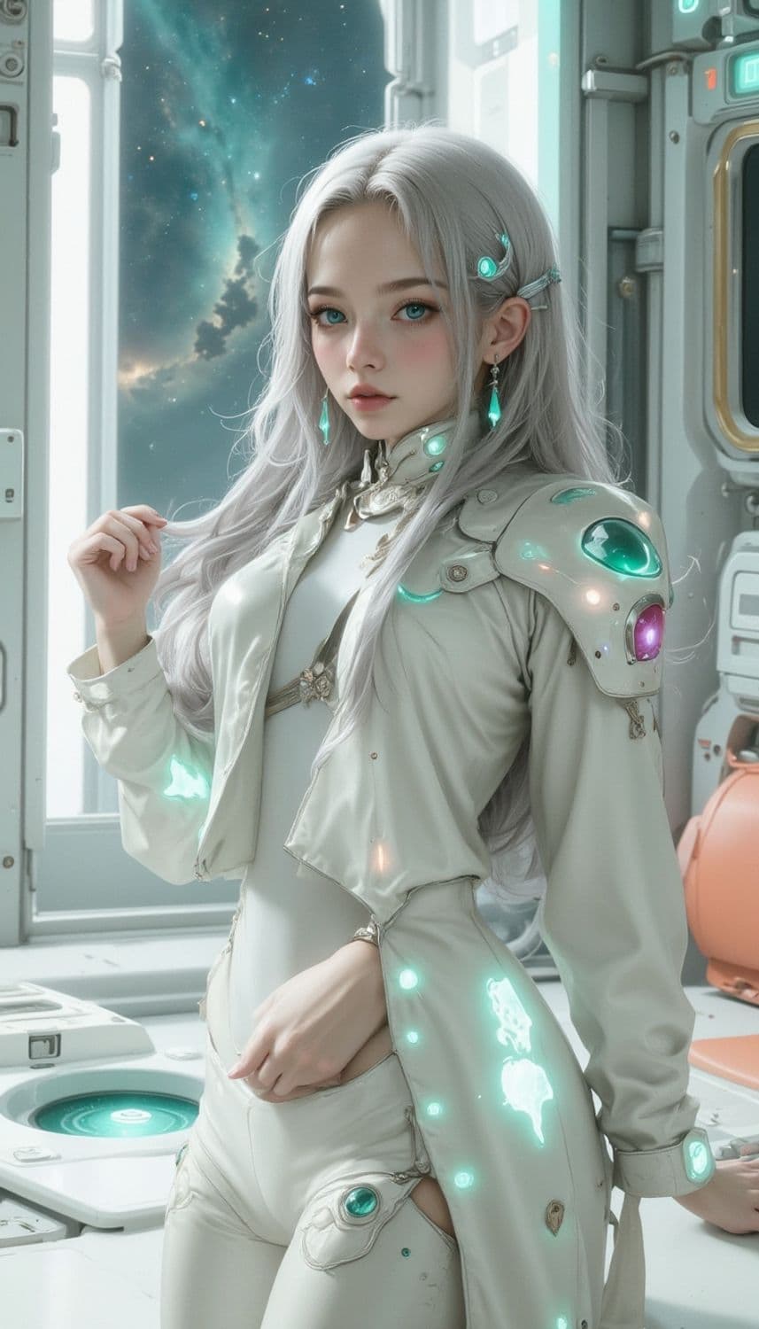 The image features a stunning female character with an ethereal presence, set in a futuristic environment. She has medium-length, flowing silver hair adorned with crescent moon accessories, giving her a celestial appearance. Her eyes are large and captivating, with a deep emerald green color, contrasting beautifully with the subtle shimmer on her cheekbones and shoulders. Her skin has a flawless, porcelain-like texture, enhancing the fantasy aspect. She wears a sleek, fitted outfit reminiscent of futuristic or space-themed fashion, primarily in metallic silver with a hint of iridescence, featuring intricate designs with glowing gemstones and patterns suggesting advanced technology or magic. The setting is inside a spacecraft or space station, with sleek metallic walls and a window revealing a vast outer space view, filled with nebulae and stars. The overall color scheme is cool, dominated by blues, greens, and silvers. The art style is detailed, with a semi-realistic approach blending fantasy and science fiction elements. The use of lighting and shading gives the image a soft, luminous quality.