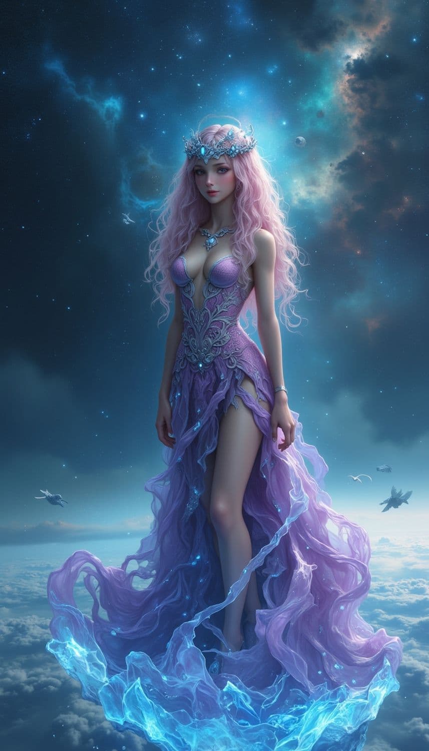 In a mystical, ethereal realm of swirling nebulae and distant stars, a captivating female figure stands on a floating, crystalline platform. Her attire is a flowing gown crafted from a fabric that seems to capture the essence of the cosmos, blending shades of deep violet and shimmering stardust. Her hair, a striking shade of cosmic pink, cascades down her back in intricate, gravity-defying curls, framing a face with delicate, serene features. Her eyes, a mesmerizing shade of nebula blue, seem to reflect the mysteries of the universe. She wears a delicate circlet made of intertwining celestial vines and tiny, luminescent opals, enhancing her mystical and otherworldly presence. The background is a breathtaking scene of swirling galaxies and gentle, glowing streams of cosmic light that weave through the realm, creating a serene and enchanting atmosphere. The style is a blend of fantasy and cosmic elegance, with a focus on vibrant color tones and intricate detailing, creating a mesmerizing and otherworldly atmosphere.