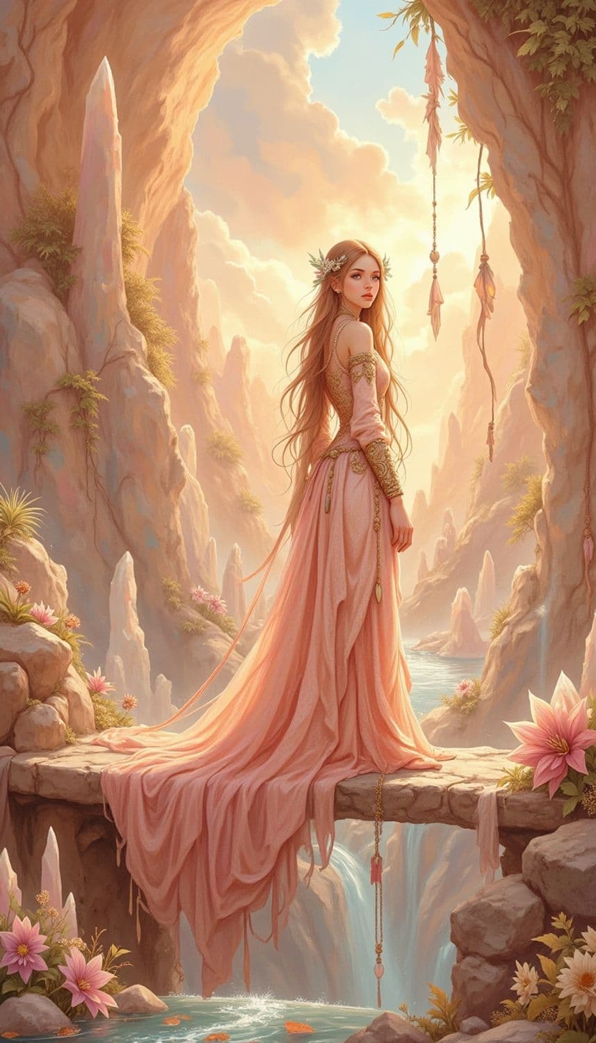 In a mystical, ethereal realm of floating, luminescent crystal caverns under a sky painted with the colors of a radiant dawn, a captivating female figure stands poised on a shimmering, translucent crystal bridge. Her attire is a flowing gown crafted from a fabric that seems to capture the essence of dawn's first light, blending shades of soft rose and shimmering opal. Her hair, a striking shade of dawn gold, cascades down her back in intricate, flowing braids, framing a face with delicate, serene features. Her eyes, a mesmerizing shade of sunrise amber, seem to reflect the mysteries of the awakening world. She wears a delicate crown made of intertwining crystal vines and tiny, luminescent topazes, enhancing her celestial and otherworldly presence. The background is a breathtaking scene of luminescent crystal caverns and gentle, glowing streams that weave through the realm, creating a serene and enchanting atmosphere. The style is a blend of fantasy and dawn elegance, with a focus on warm color tones and intricate detailing, creating a mesmerizing and otherworldly atmosphere.