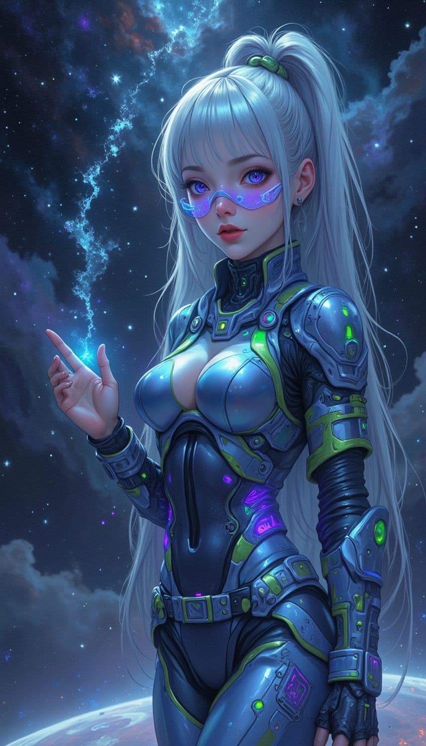A futuristic female character with long white hair stands in a cosmic setting. She is wearing a high-tech bodysuit with glowing neon accents and is gesturing with her hand, seemingly creating a small cosmic energy. Her eyes are a striking shade of purple and she sports a visor with neon details. The background features a view of space, complete with stars and nebulae.