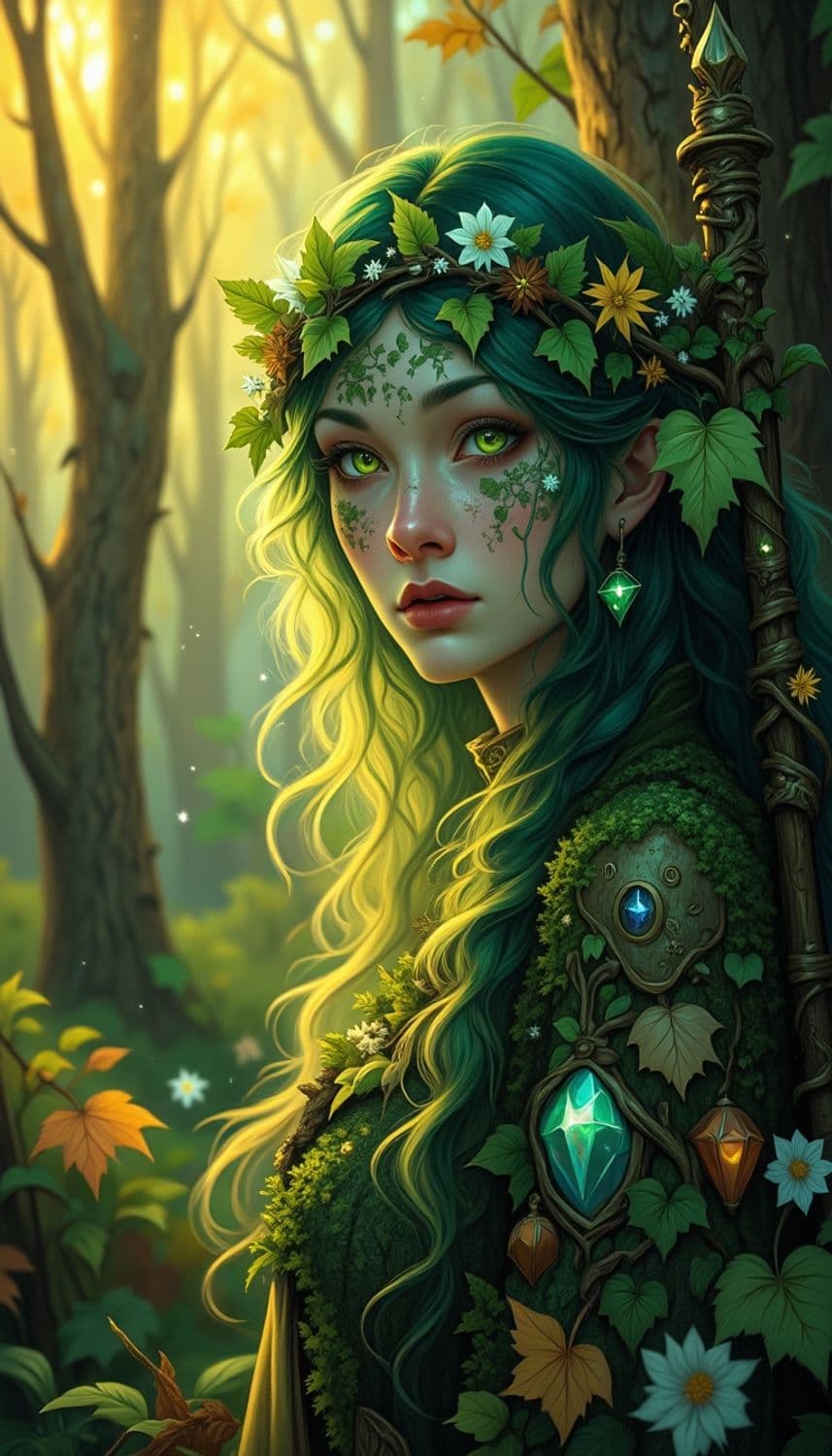 The image depicts an enchanting forest maiden with captivating green eyes and flowing green hair interwoven with leaves and flowers. Her attire is richly decorated with ornate patterns and natural elements. Her presence is mystical and ethereal, set against a sunlit forest backdrop.