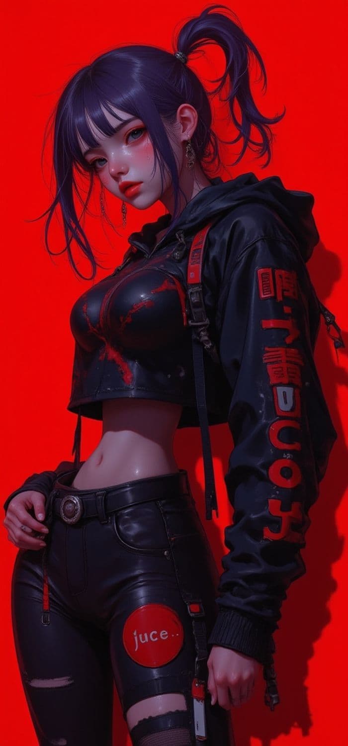 A striking artwork of a young woman with purple hair styled in a high ponytail. She wears a black leather jacket with red accents and tight pants, against a vivid red background. The design features bold graphics and a futuristic vibe.