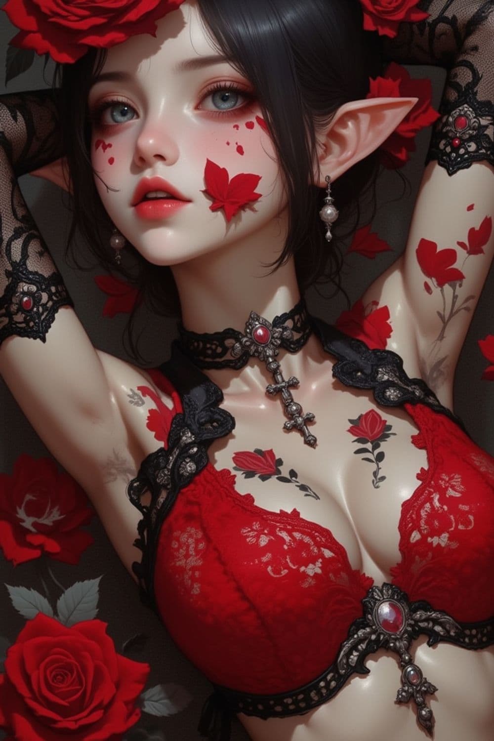 A captivating fantasy character with long, pointed elf ears, adorned in intricate gothic attire. Her outfit features red lace and black detailing, complemented by a choker with a gemstone. Red roses and floral tattoos accentuate her appearance, creating a vivid and enchanting atmosphere. Her makeup is striking, with red hues enhancing her features.