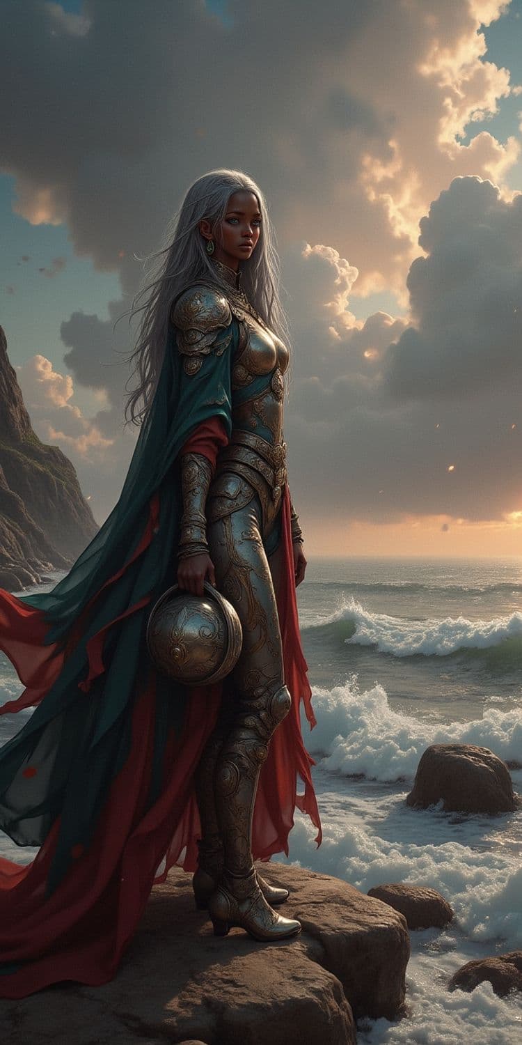A warrior woman stands majestically on a rocky shore, clad in ornate armor. Her long, silver hair flows gracefully in the breeze. She holds a detailed helmet by her side. The backdrop features waves crashing against the rocks and a dramatic sky with vibrant clouds, illuminated by the setting sun.