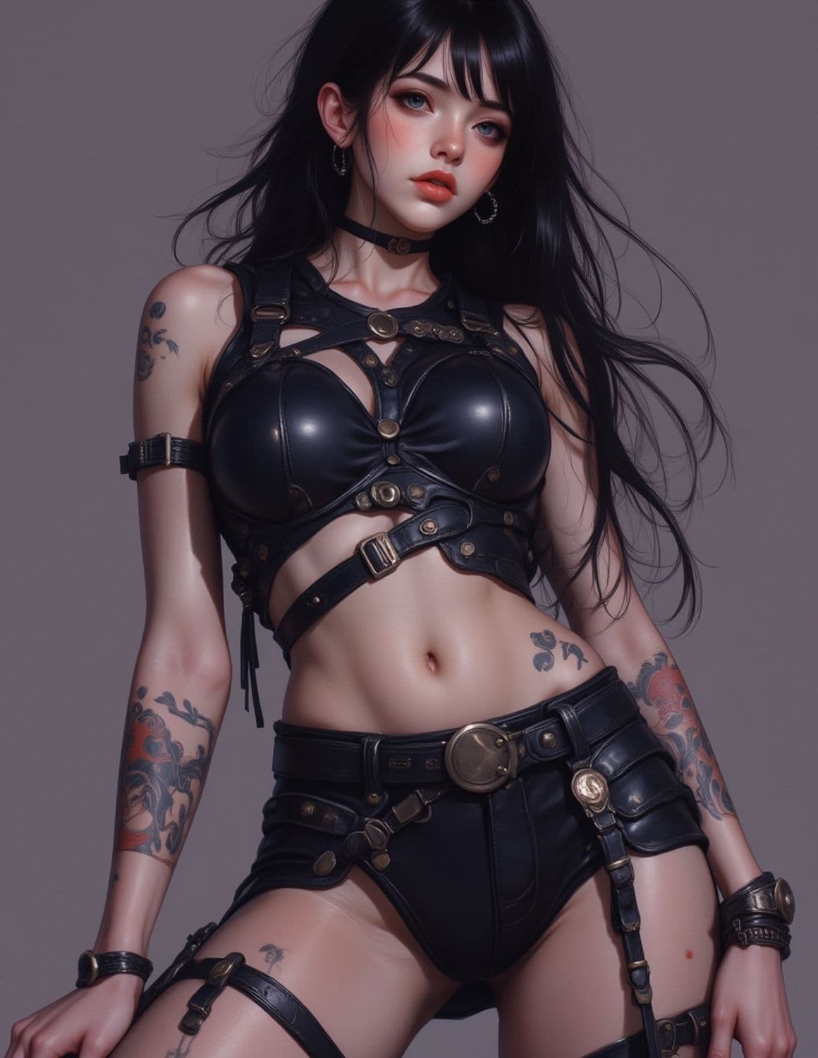 A striking character with long, flowing black hair and a confident expression. She is wearing an intricately designed black leather harness and belt, adorned with metallic buckles and fasteners. Her arms and legs display detailed tattoos, adding to her edgy and powerful appearance. Her gaze is intense, and she exudes a sense of strength and mystery.