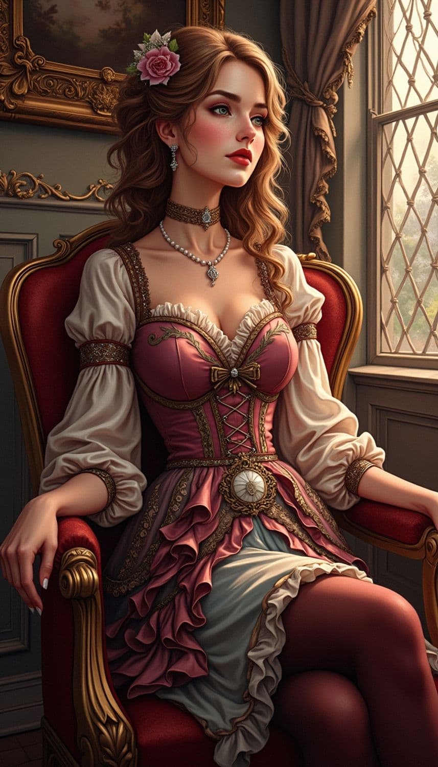 The image depicts a woman seated on an ornate red and gold armchair in a room with elegant interior design. She is wearing a sophisticated, period-inspired gown with a fitted bodice, ruffled skirt, and long, puffed sleeves. The gown is primarily pink with gold embroidery and lace detailing. The woman has long, wavy, brown hair adorned with a pink rose and greenery, enhancing her vintage appearance. Her makeup is subtle, featuring red lipstick and softly blushed cheeks. She wears delicate jewelry, including a pearl necklace with a pendant, matching earrings, and a decorative choker. The background features a classic setting with wood paneling, draped curtains, and a diamond-patterned lattice window, allowing diffused natural light to enter. The style of the image is reminiscent of romantic or Victorian-era art, characterized by rich colors, detailed textures, and an overall sense of elegance and opulence.