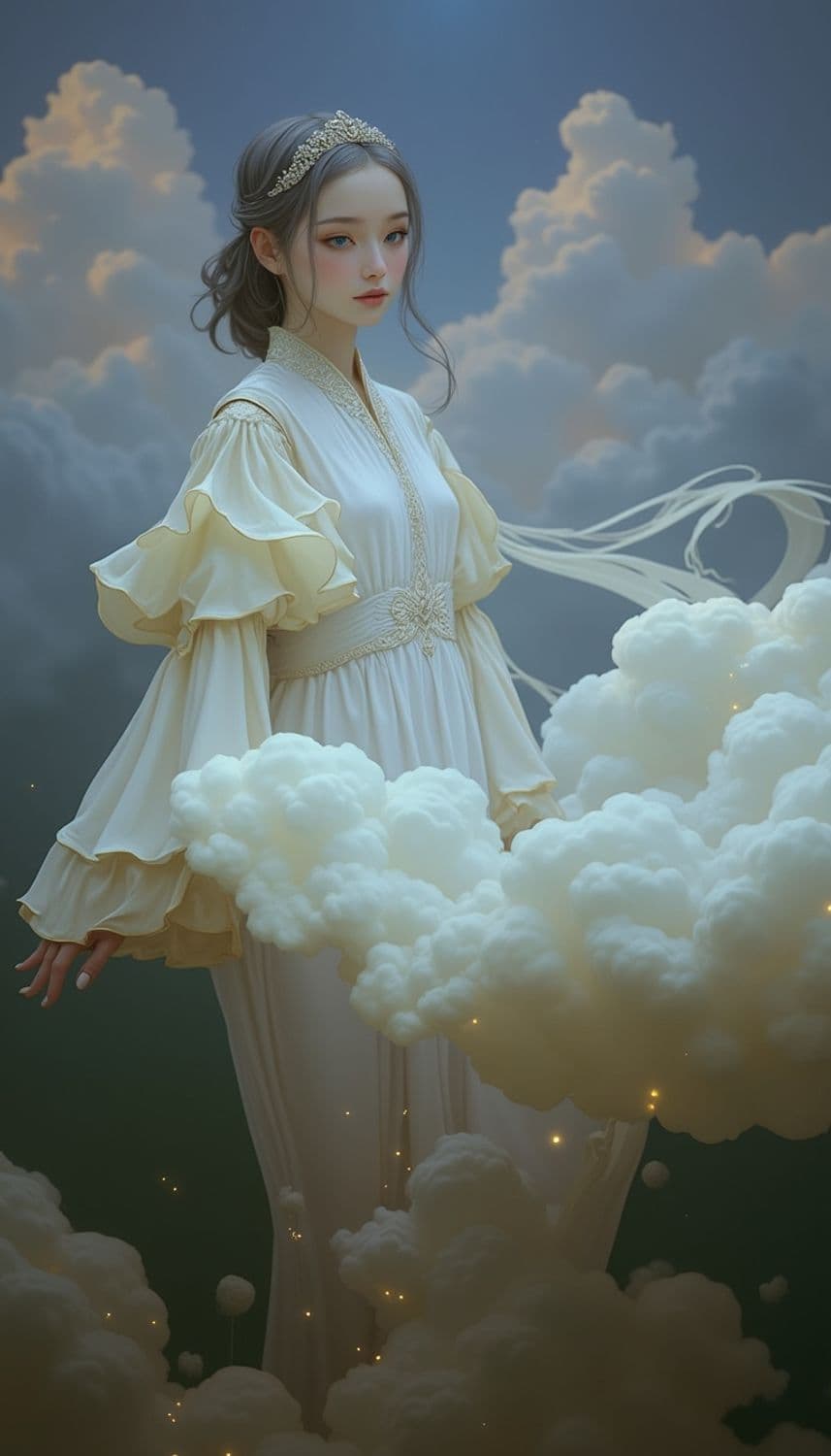 In a mystical, ethereal realm of floating, luminescent cloud archipelagos under a sky painted with the colors of a serene twilight, a captivating female figure stands poised on a shimmering, translucent cloud platform. Her attire is a flowing, elegant robe crafted from a fabric that seems to capture the essence of celestial tranquility, blending shades of soft ivory and shimmering gold. Her hair, a striking shade of twilight silver, cascades down her back in intricate, flowing spirals, framing a face with delicate, serene features and a gentle, enigmatic smile. Her eyes, a mesmerizing shade of moonlit blue, seem to reflect the mysteries of the celestial world. She wears a delicate tiara adorned with tiny, luminescent cloud patterns and silver stardust, enhancing her celestial and otherworldly presence. The background is a breathtaking scene of luminescent cloud archipelagos and gentle, glowing streams of twilight light that weave through the realm, creating a serene and enchanting atmosphere. The style is a blend of fantasy and celestial elegance, with a focus on soft color tones and intricate detailing, creating a mesmerizing and otherworldly atmosphere.