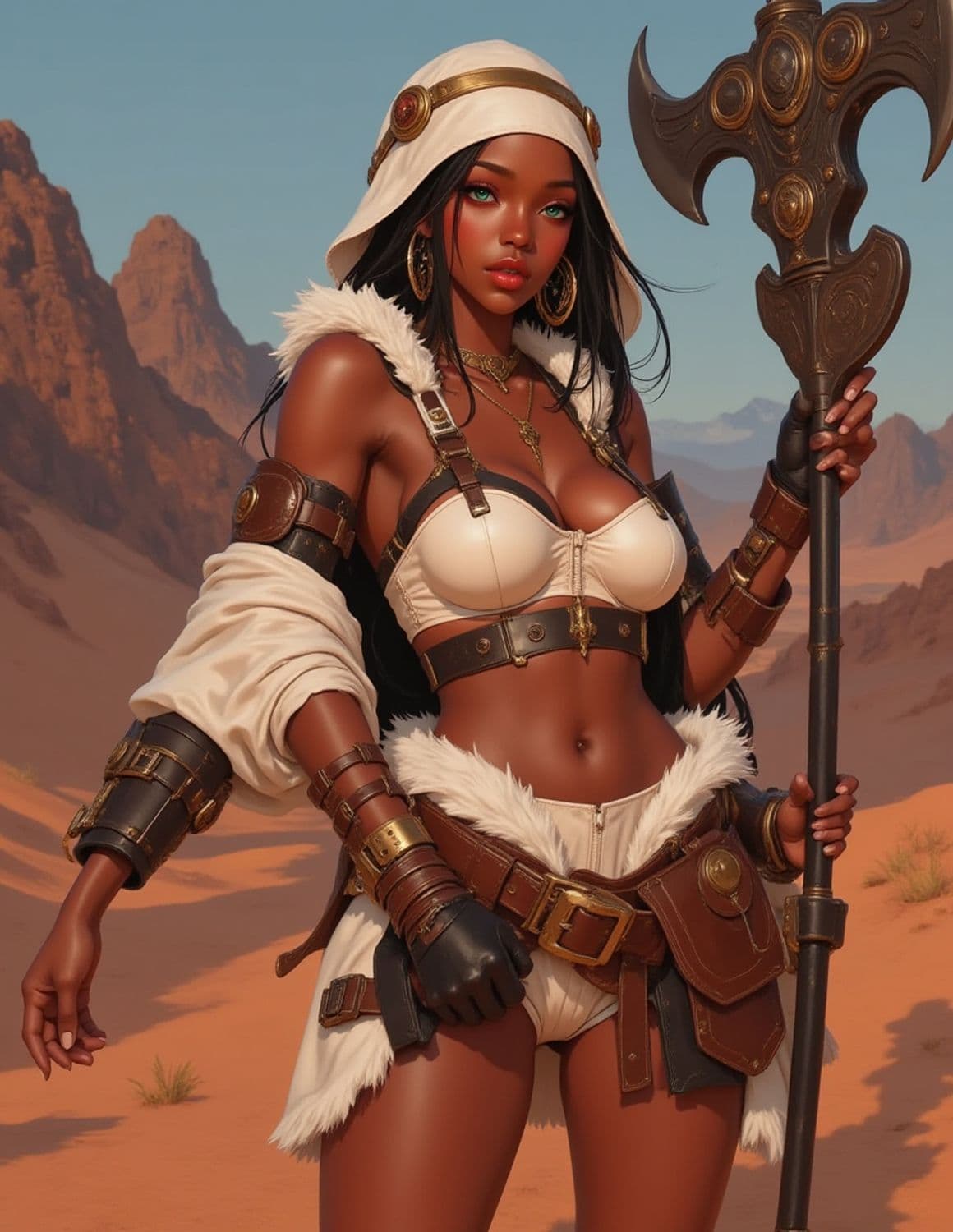 A warrior with dark skin stands confidently in a desert landscape. Her attire includes a white bikini-style top and shorts lined with fur, leather straps, and metallic buckles. She wears a white hood and gold jewelry, including hoop earrings and a necklace, with her long black hair flowing freely. In her hand, she holds an ornate staff with intricate designs. The backdrop is a classic desert setting with tall, reddish-brown rocky formations under a clear blue sky.