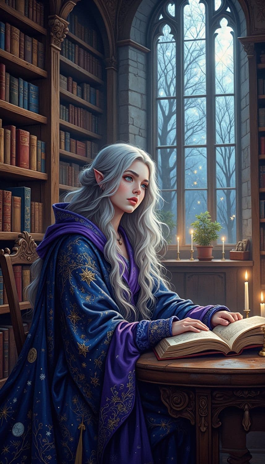 Depicting a magical scene within an ancient library, a scholarly woman is seated at a grand wooden table, surrounded by towering shelves of ancient tomes. She wears a robe of deep violet and royal blue, embroidered with celestial patterns. Her hair is a striking silver, cascading down her back, and her eyes glow with an otherworldly light. She is engrossed in a massive, illuminated manuscript, with arcane symbols hovering above its pages. The library is dimly lit, with candles casting flickering shadows and a large stained glass window filtering in moonlight. The style is intricate, blending elements of fantasy and academia to create a mysterious and intellectual atmosphere.