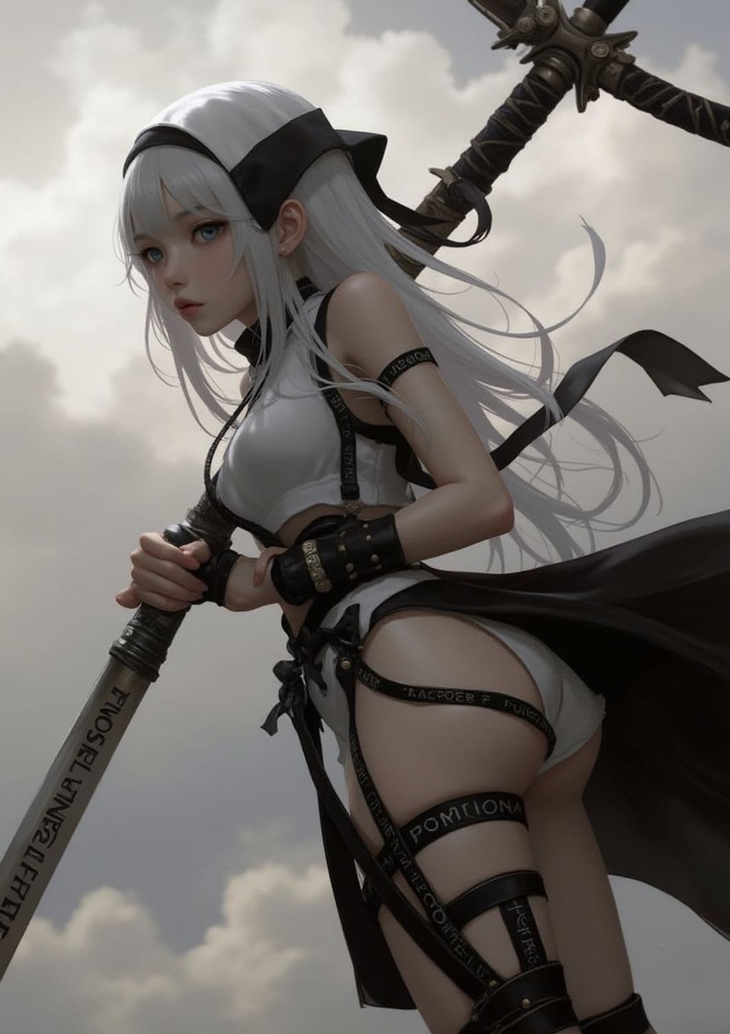 A digital artwork depicts a young woman with long white hair and striking blue eyes, dressed in a minimalistic black and white outfit with intricate designs. She carries a large, ornate sword and a determined expression. The background features a cloudy sky, adding to the mysterious and powerful ambiance.