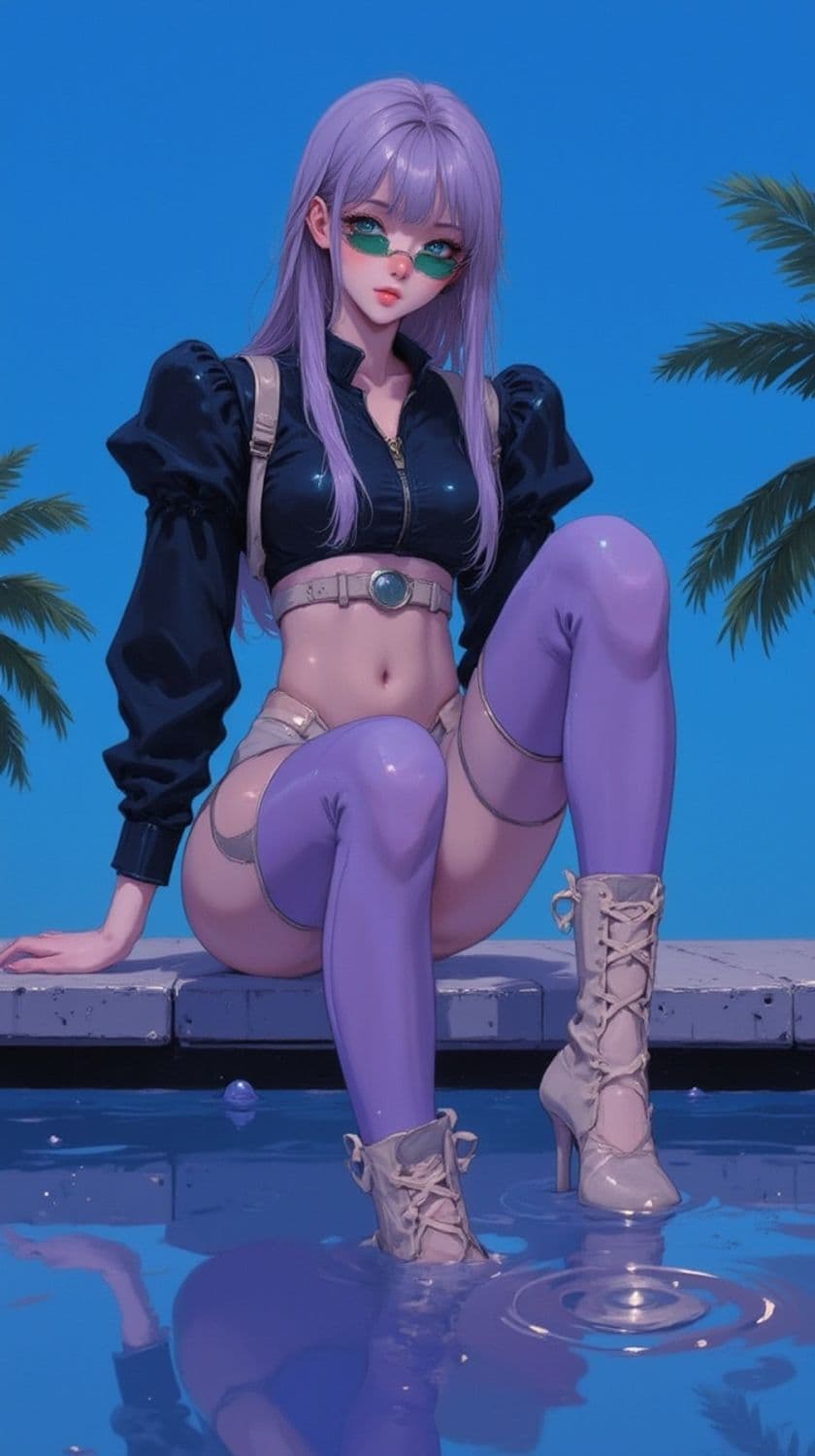 A striking anime-inspired character with long lavender hair sits confidently near a reflective pool. She wears a chic black top with puffed sleeves, light purple high-waisted shorts, and matching thigh-high stockings. Her green-tinted glasses add a touch of mystery. The scene is set outdoors with clear blue skies and palm trees in the backdrop, creating a relaxed yet vibrant atmosphere.