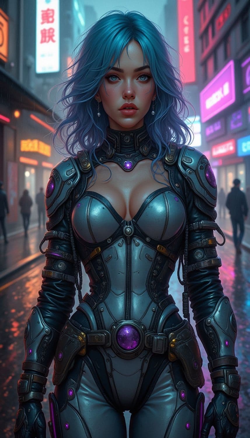 A futuristic warrior with vibrant blue hair stands confidently in a neon-lit cityscape. She wears advanced armor featuring purple energy orbs and intricate mechanical details. The background showcases a bustling urban environment with colorful signage and misty atmospheric conditions.