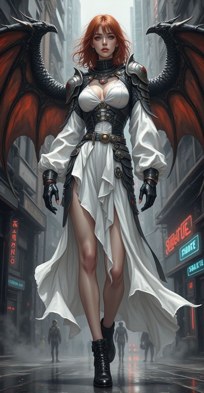 A striking woman stands confidently in a cityscape, donning a blend of Gothic and fantasy armor. Her outfit includes metallic shoulder guards and a white flowing gown, exuding a powerful yet ethereal presence. Completing her ensemble are dragon-like wings with a dark, leathery texture and a clawed, ferocious design. Her red hair cascades around her shoulders, enhancing her fierce and mysterious aura. The background reveals a misty urban setting with blurred figures and neon signs, adding a modern contrast to her otherworldly appearance.