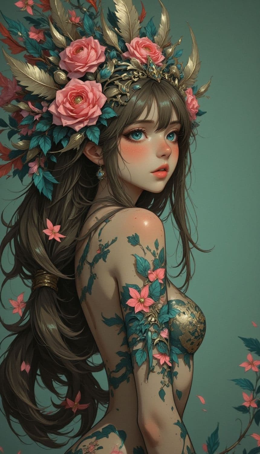 A fantasy character with intricate tattoos of leaves and pink flowers covering her body stands elegantly. She wears an ornate headdress adorned with golden leaves and large pink roses, blending nature with regal elements. Her large, expressive eyes gaze thoughtfully, as her long, flowing hair cascades down her back.