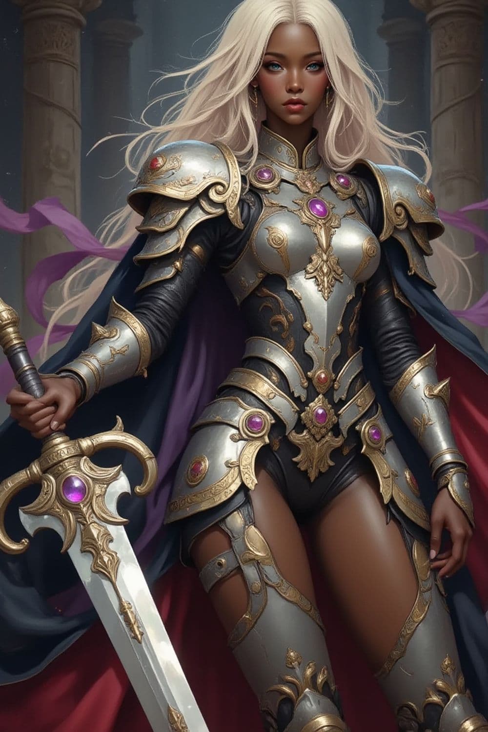 The image features a warrior standing confidently in an elaborate suit of ornate silver and gold armor adorned with purple gemstones. The warrior has long, flowing blonde hair and holds a large, intricately designed sword in her hand. The scene is set against what appears to be an ancient architectural backdrop with columns. The warrior's expression is determined and fierce, indicating readiness for battle.