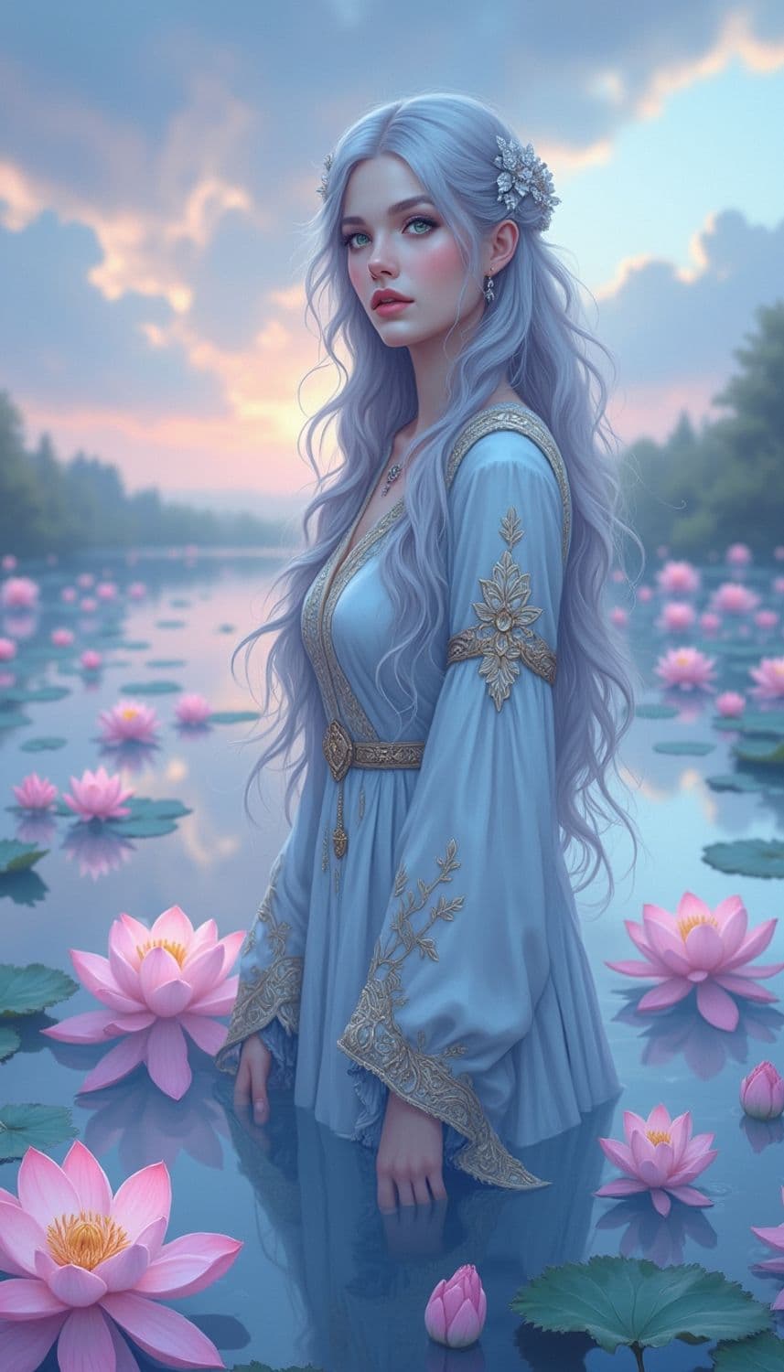 A serene scene depicts a woman with long, flowing silver hair standing in a tranquil lake adorned with blooming pink lotus flowers. She wears an elegant blue dress with intricate gold embroidery, creating a harmonious blend with the peaceful surroundings. The soft, warm colors of the sunset glow in the background, enhancing the image's ethereal quality.