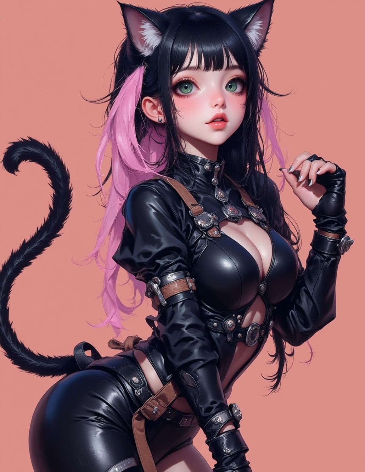 The image features an anime-style character with large, green eyes and a petite mouth. She has black cat ears with pale pink accents and long, flowing black hair with pink streaks. Her outfit is a sleek, black, leather-like costume adorned with metallic buckles and straps, hugging her figure closely. The character also has a black, fluffy tail curling behind her. She stands against a plain peach-colored background, her expression curious and playful.