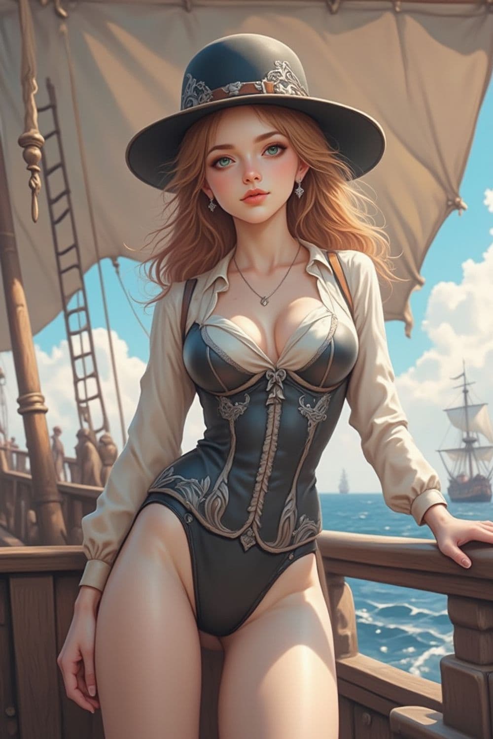 A young woman stands confidently on the deck of a vintage ship, surrounded by the open ocean. She wears a stylish combination of a corset and a blouse, paired with a wide-brimmed hat adorned with intricate designs. Her long hair flows freely, and she gazes directly with bright eyes, exuding a sense of adventure and mystery.