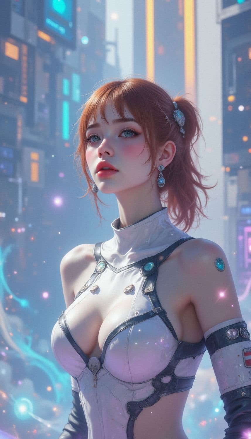 The image portrays a futuristic young woman with red hair styled in a ponytail, adorned with a decorative hair clip. Her attire is a sleek, high-collared outfit with metallic embellishments and glowing details, suggesting a sci-fi or cyberpunk theme. The background features a cityscape with neon lights and digital screens, casting an ethereal glow around her.