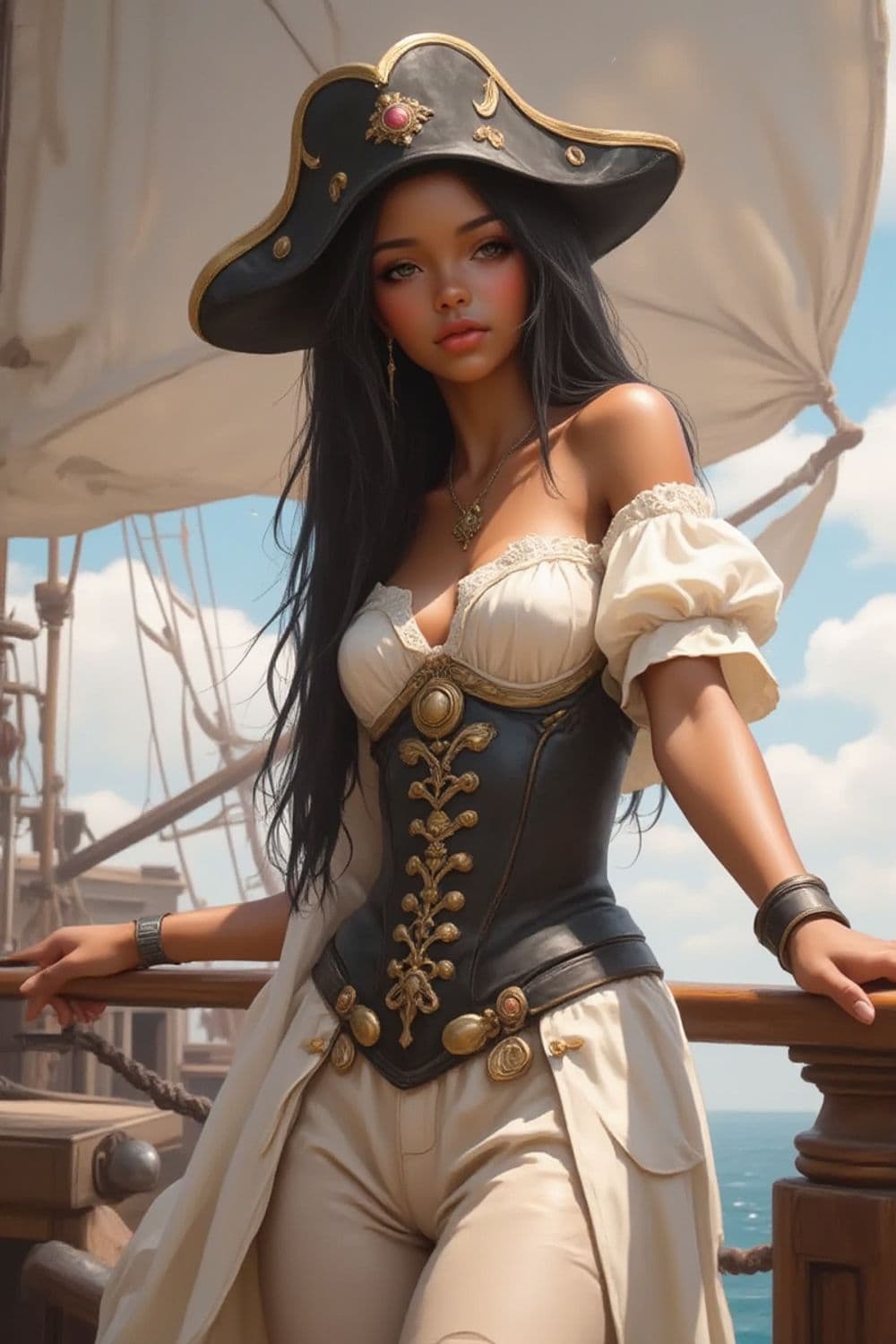 A captivating image of a pirate woman standing on the deck of a ship. She is dressed in a vintage pirate outfit with a black, ornate leather corset and a billowing, off-the-shoulder white blouse. Her long black hair cascades down her shoulders, and she wears a large black pirate hat adorned with a red gem. The background reveals a clear blue sky and the sails of the ship, conveying a sense of adventure on the high seas.