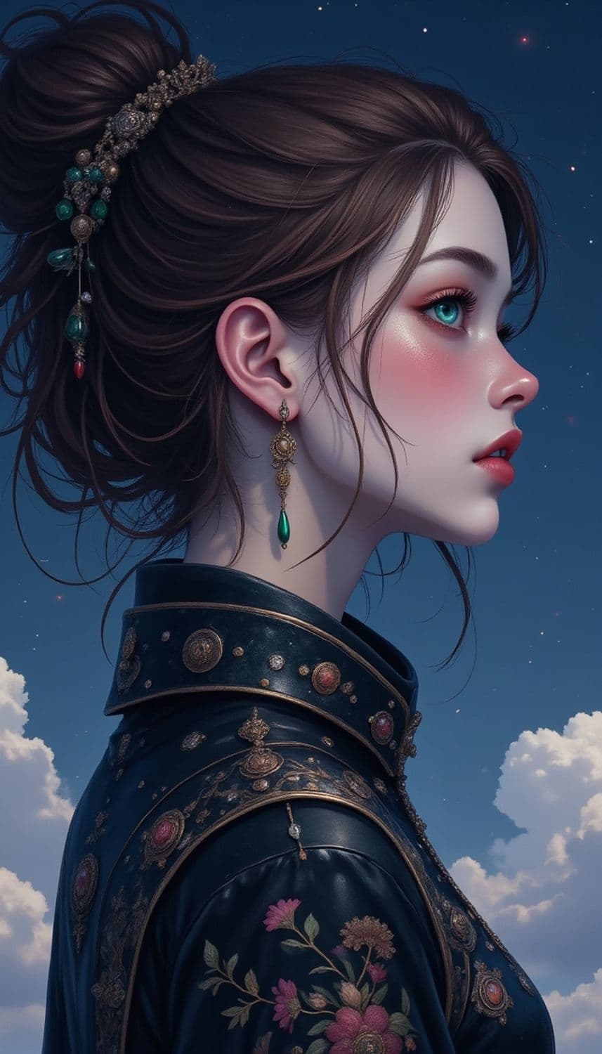 The image showcases a profile view of a woman against a twilight sky. Her hair is styled in an elegant bun adorned with intricate gold and green ornaments. She wears a high-collared, richly embroidered blue jacket with floral patterns and gold detailing. Her makeup highlights her sharp features, with striking blue eyes and a rosy complexion.