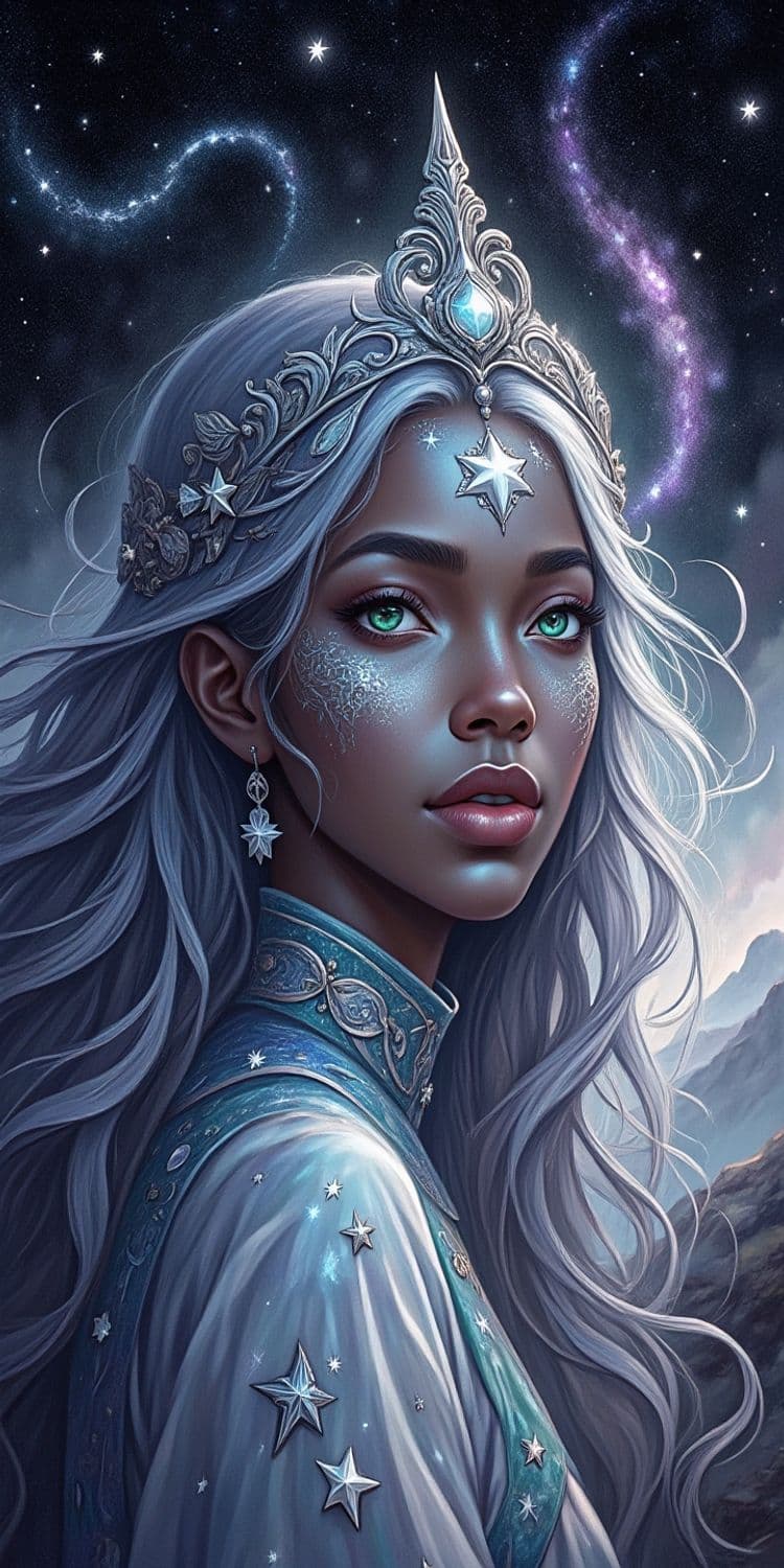 A mystical and ethereal woman with glowing green eyes, framed by long silver hair, stands against a backdrop of a starry night sky. Her attire is adorned with shimmering stars, and she wears an intricate silver tiara with a glowing gem at the center. The cosmic scenery in the background includes swirling galaxies and distant mountains.