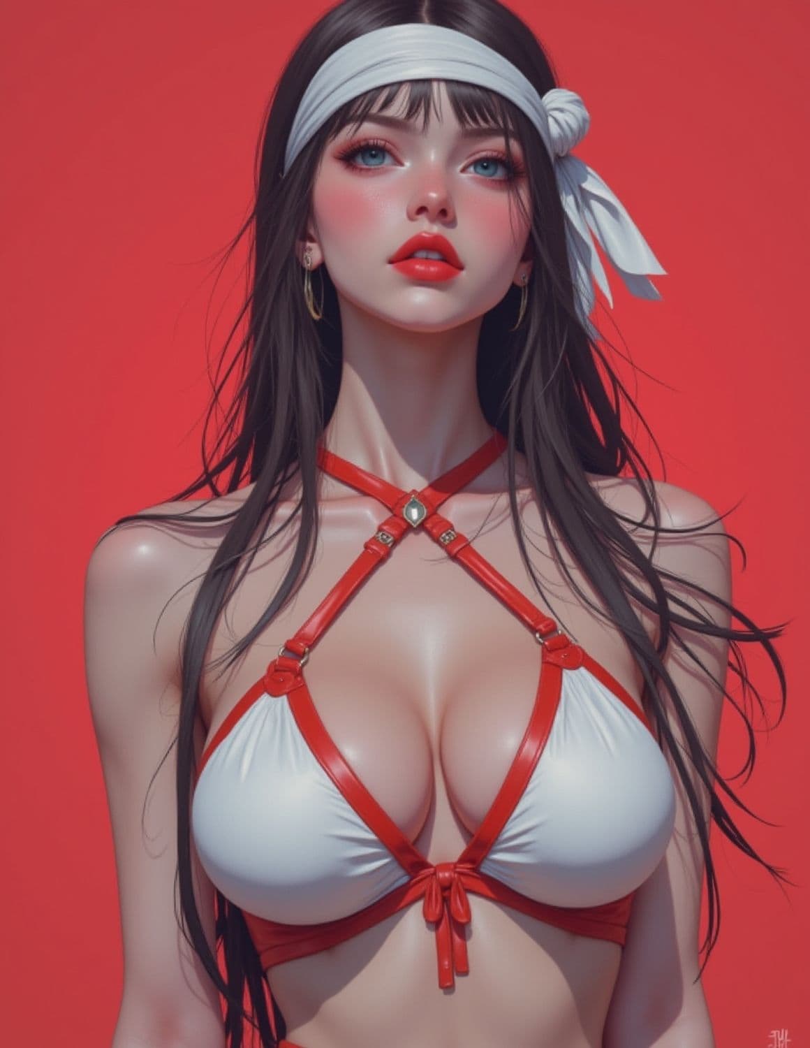 A striking digital artwork featuring a woman with long dark hair flowing down her shoulders. Her makeup is vibrant, emphasizing her bold red lips and piercing blue eyes. She wears a red and white strappy bikini top, paired with a white headband that wraps around her forehead, tied off to one side. The background is a solid red, enhancing the intensity of the image.