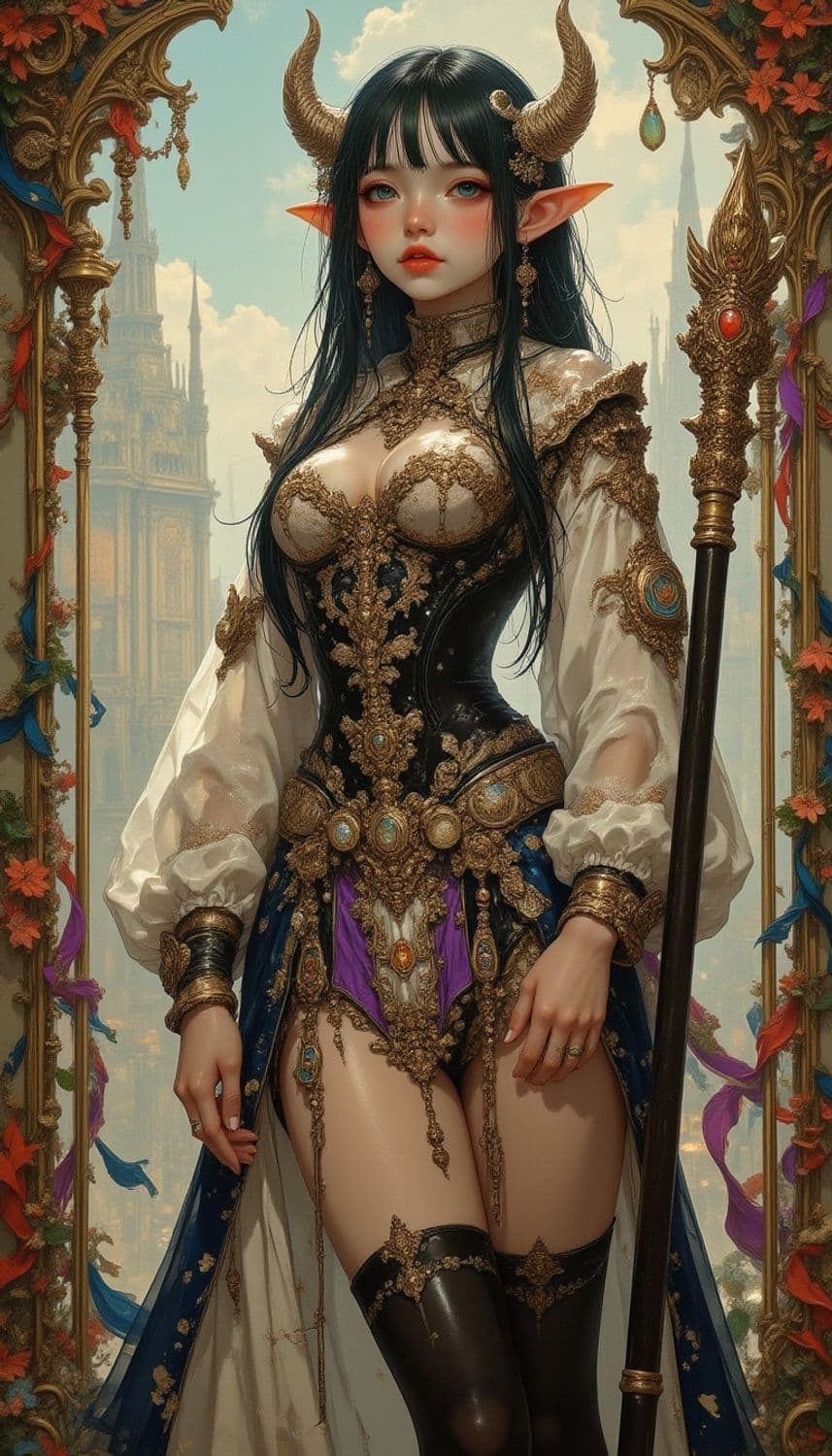 A mystical female character stands gracefully in an ornate doorway with Gothic elements in the background. She possesses long black hair, pointed ears, and golden horns. Her attire is richly decorated with intricate gold embroidery, gemstones, and a corset over a flowing gown. She holds a majestic staff adorned with jewels. The scene is accentuated with vibrant floral elements and a clear sky in the backdrop.