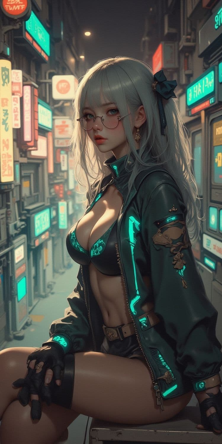 A futuristic character with long silver hair and glasses, wearing a dark, high-tech jacket with glowing neon details. She sits confidently in a cyberpunk cityscape with vibrant, illuminated signage in the background. Her attire includes fingerless gloves and a unique accessory on her ear, adding to her enigmatic allure.