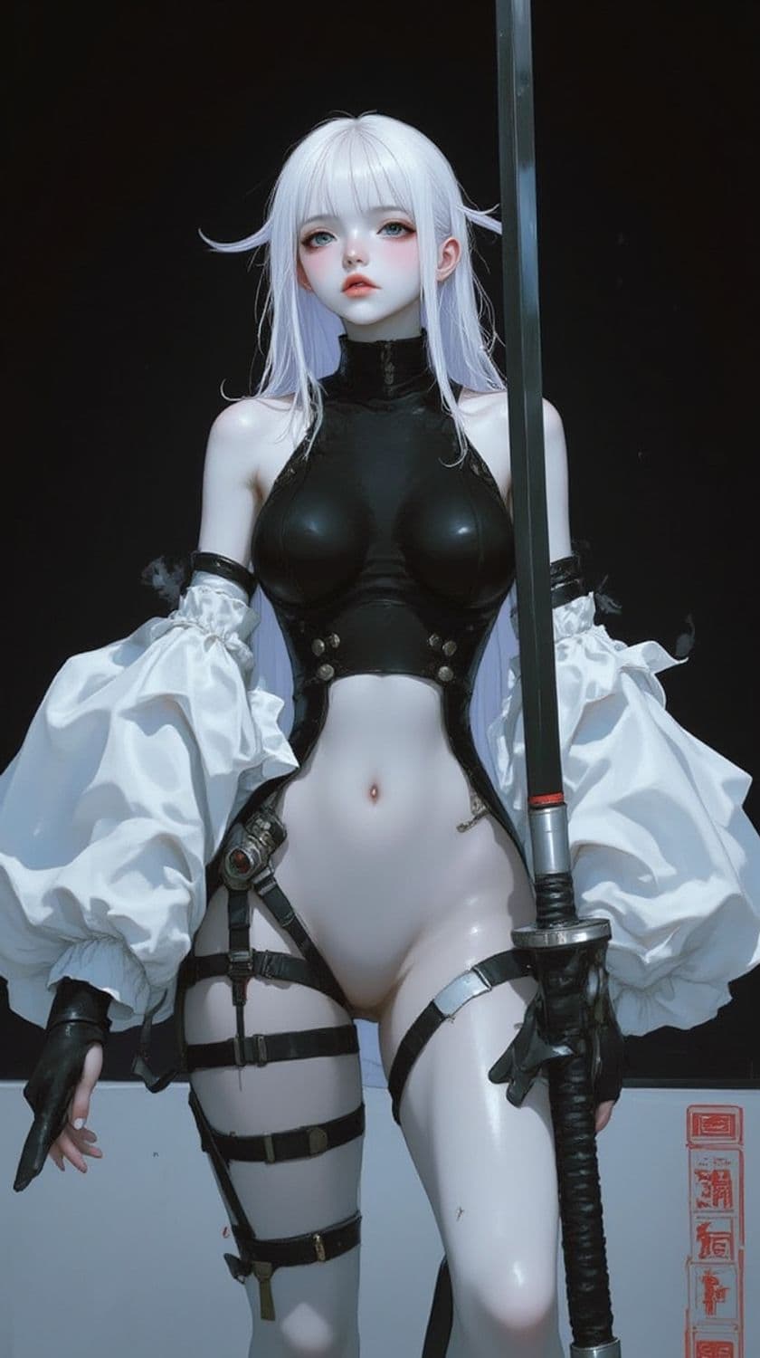 The image features a striking character with long white hair and a porcelain complexion, donned in a sleek black bodysuit. Her ensemble is complemented by voluminous white sleeves and black leather straps that wrap around her thighs. She holds a katana confidently, exuding a powerful and enigmatic aura. The background is a dark canvas, highlighting her ethereal presence.