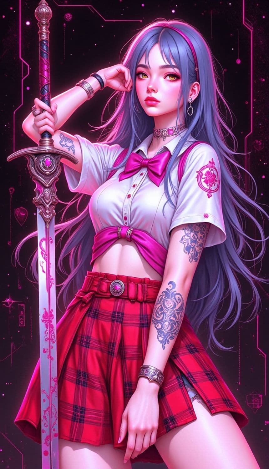 A vivid illustration of a character wearing a stylish white blouse with a pink bow and a red plaid skirt. She has long, flowing purple hair and vibrant yellow eyes. The character is holding an ornate sword with pink details, and has tattoos on her left arm. The background is a futuristic pink and black digital realm.