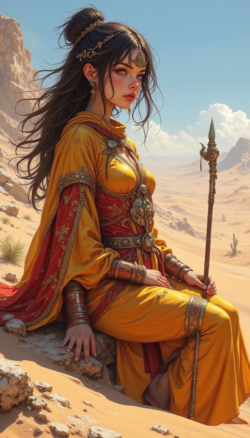 A regal figure sits gracefully in a serene desert landscape. She is adorned in a flowing golden and red garment intricately designed with ornate patterns. Her long, dark hair is styled in an elegant updo, accentuated by delicate jewelry and headpieces. The image captures the essence of her poised elegance and strength as she holds a decorative staff, exuding a mystical aura against the vast backdrop of sand dunes and rocky formations.