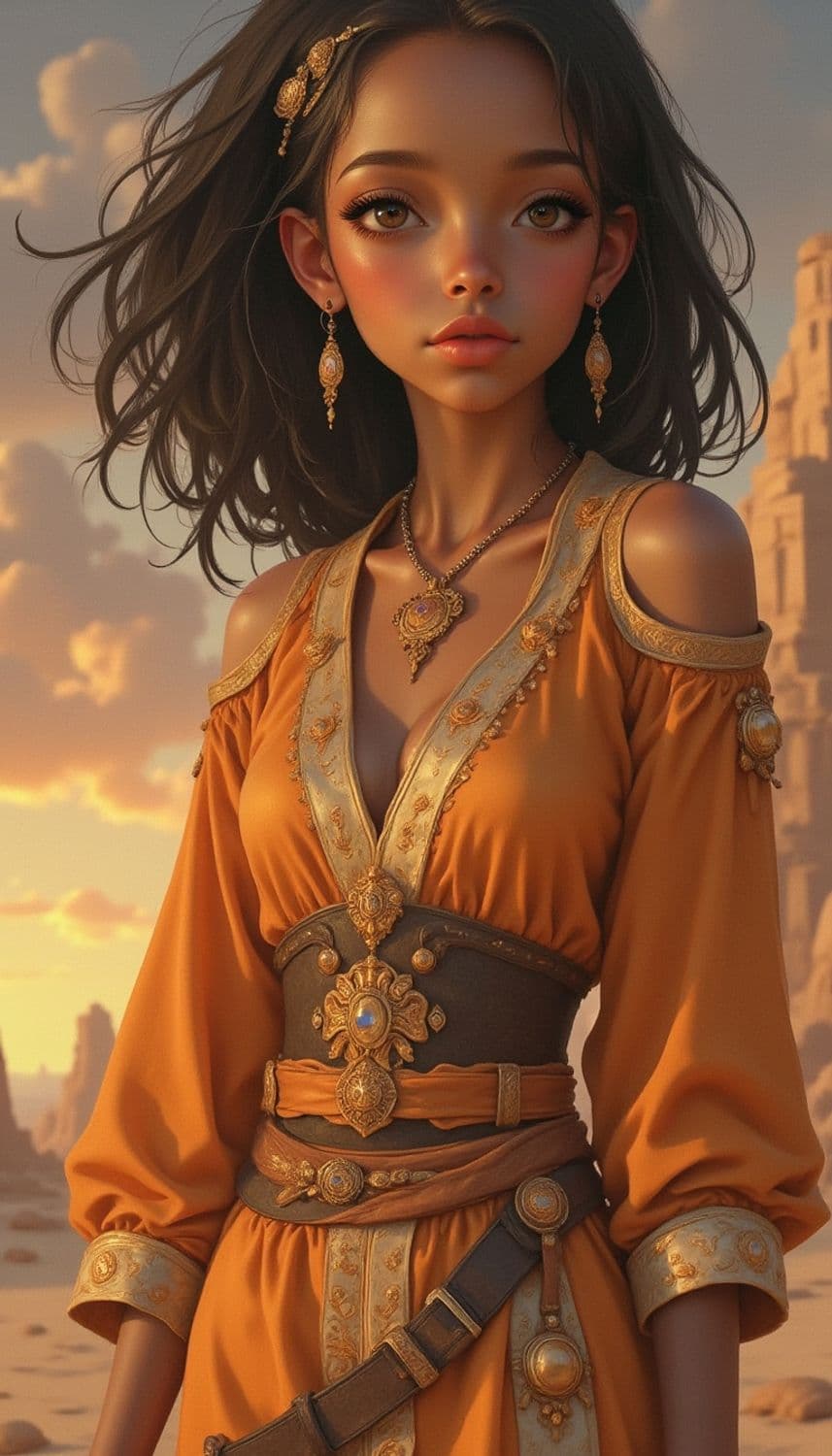 An enchanting young woman stands against a sunlit desert backdrop. She wears an intricately designed orange dress adorned with gold embroidery and ornate jewelry. Her captivating, wide eyes and soft expression complement the elegant headpiece and dangling earrings. The background features sandy hues and distant rock formations, contributing to a mystical ambiance.