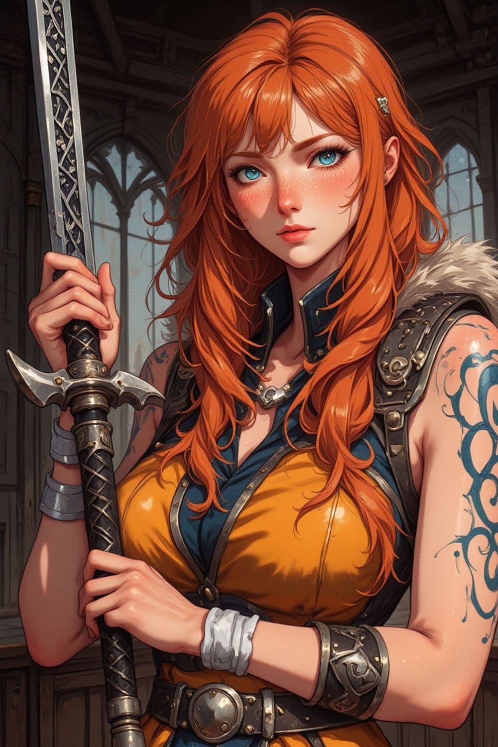 A striking warrior with fiery red hair and piercing blue eyes stands with confidence, gripping a sword and wearing a leather and fur-accented armor. Her arm is adorned with intricate blue tattoos that contrast against her vibrant outfit. The background suggests a medieval or fantasy setting with architectural elements.
