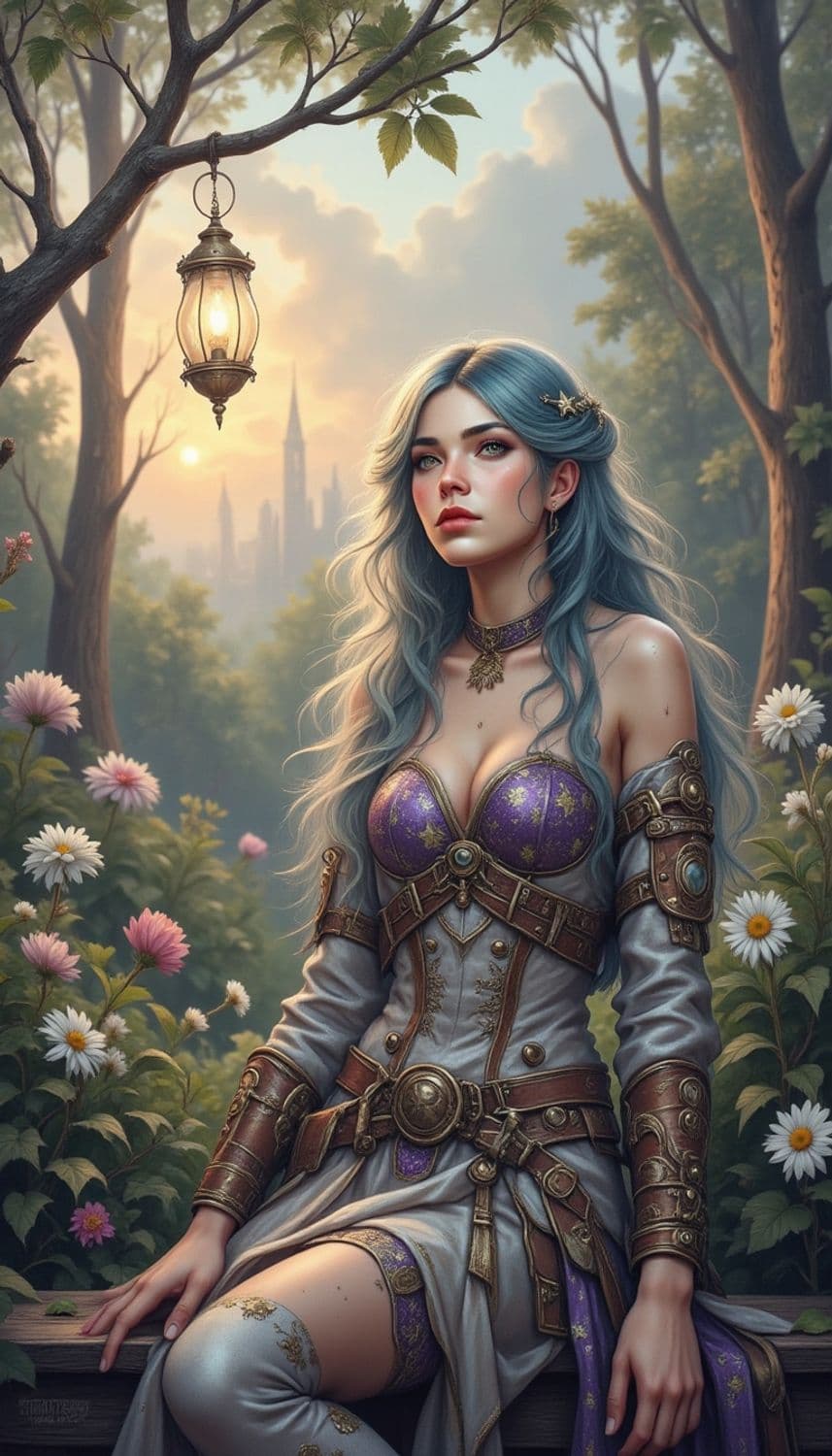 A mystical scene featuring a woman with flowing blue hair sitting amidst a lush forest. She is dressed in an elaborate purple and gold outfit adorned with intricate patterns and metallic armor accents. A warm, glowing lantern hangs from a nearby tree, illuminating the serene setting. In the background, a silhouette of distant towers rises against a soft sunset sky.
