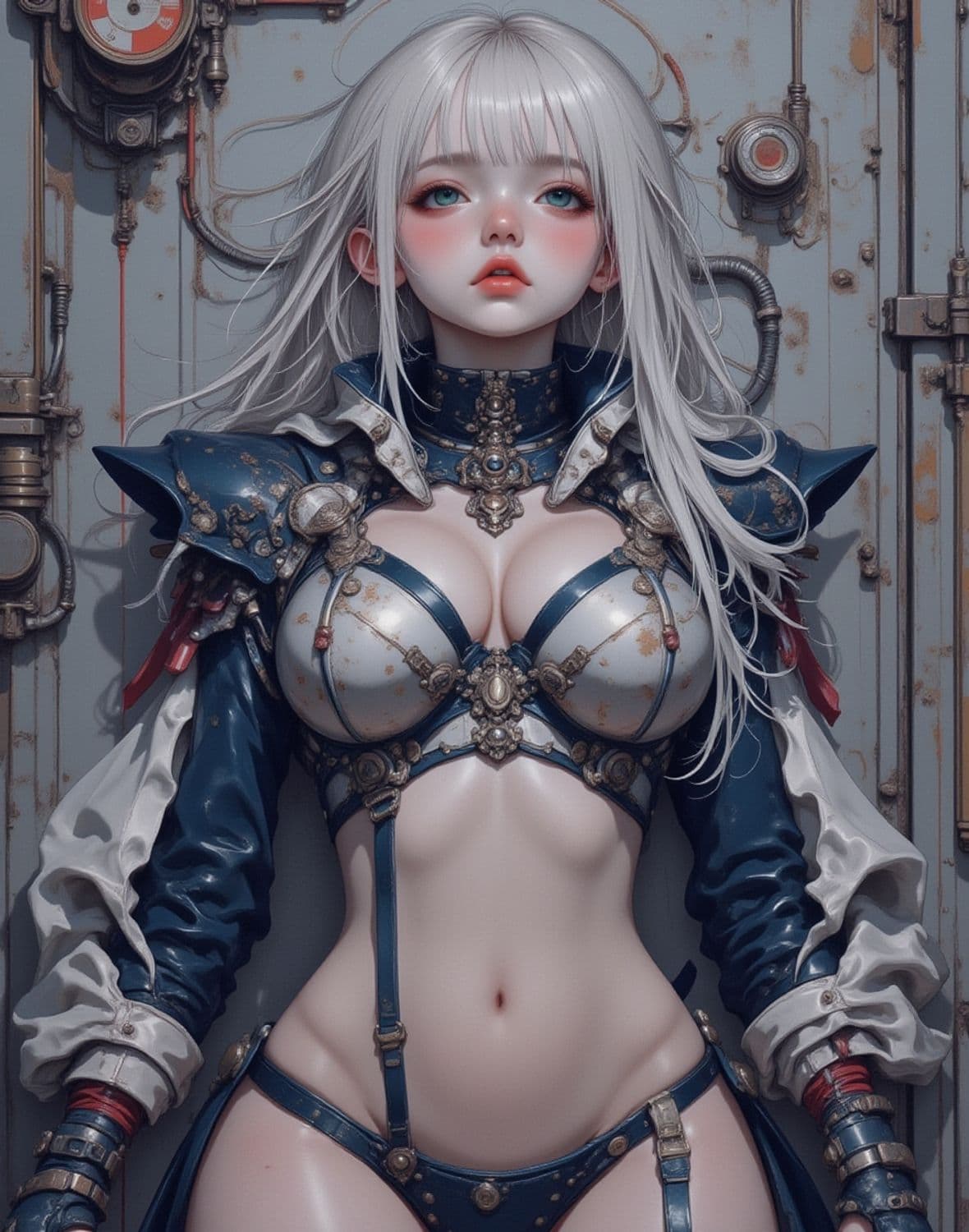 A striking figure features a woman with long, silver-white hair cascading down her shoulders. Her attire merges futuristic elements with medieval armor, adorned with intricate metallic embellishments. The background presents a mechanical wall, enhancing the sci-fi aesthetic.