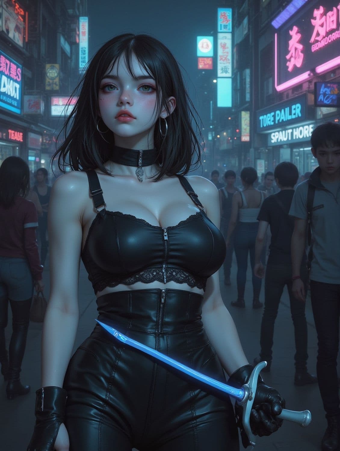A young woman stands confidently in a bustling nighttime cityscape, illuminated by neon signs. She has chin-length black hair and wears hoop earrings, a choker, and a leather outfit. Her outfit includes a form-fitting black leather top with lace trim and matching high-waisted pants. She holds a sword with a glowing blue blade, highlighting her bold stance against the urban backdrop filled with blurred figures.