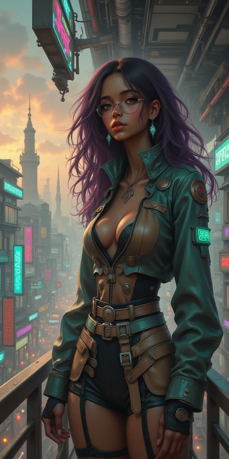A futuristic cityscape sets the backdrop for a striking figure with flowing purple hair and stylish eyewear. She wears a form-fitting, metallic jacket highlighted with complex straps and buckles. The neon signs of the bustling city contrast against the soft, glowing evening sky, adding to the vibrant atmosphere.
