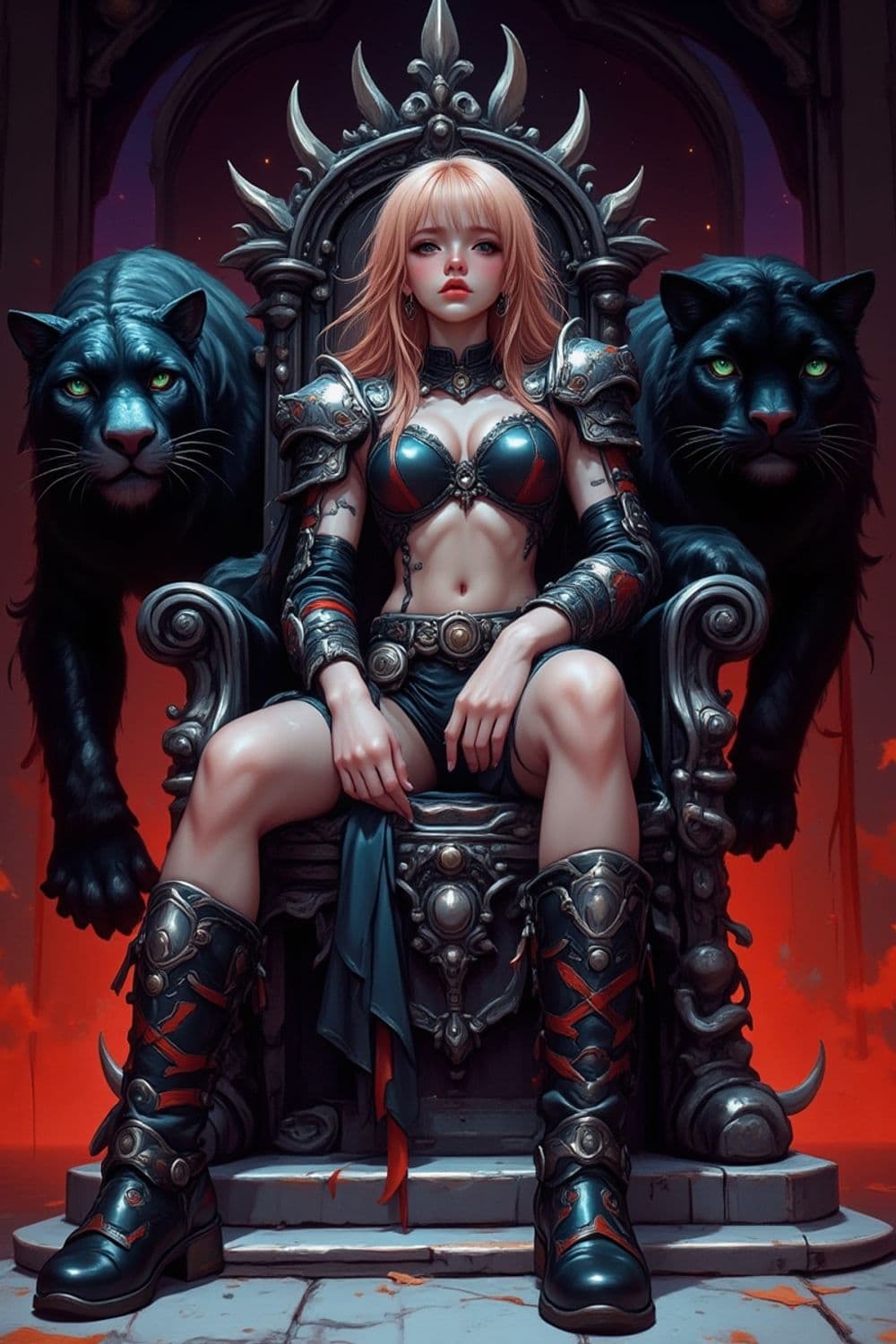 A powerful female warrior with flowing blonde hair sits on an ornate throne. She is clad in intricate armor that accentuates her strength and poise. On either side of her are two majestic black panthers with glowing green eyes, symbolizing loyalty and power. The backdrop is fiery red, enhancing the intensity and dramatic presence of the scene.