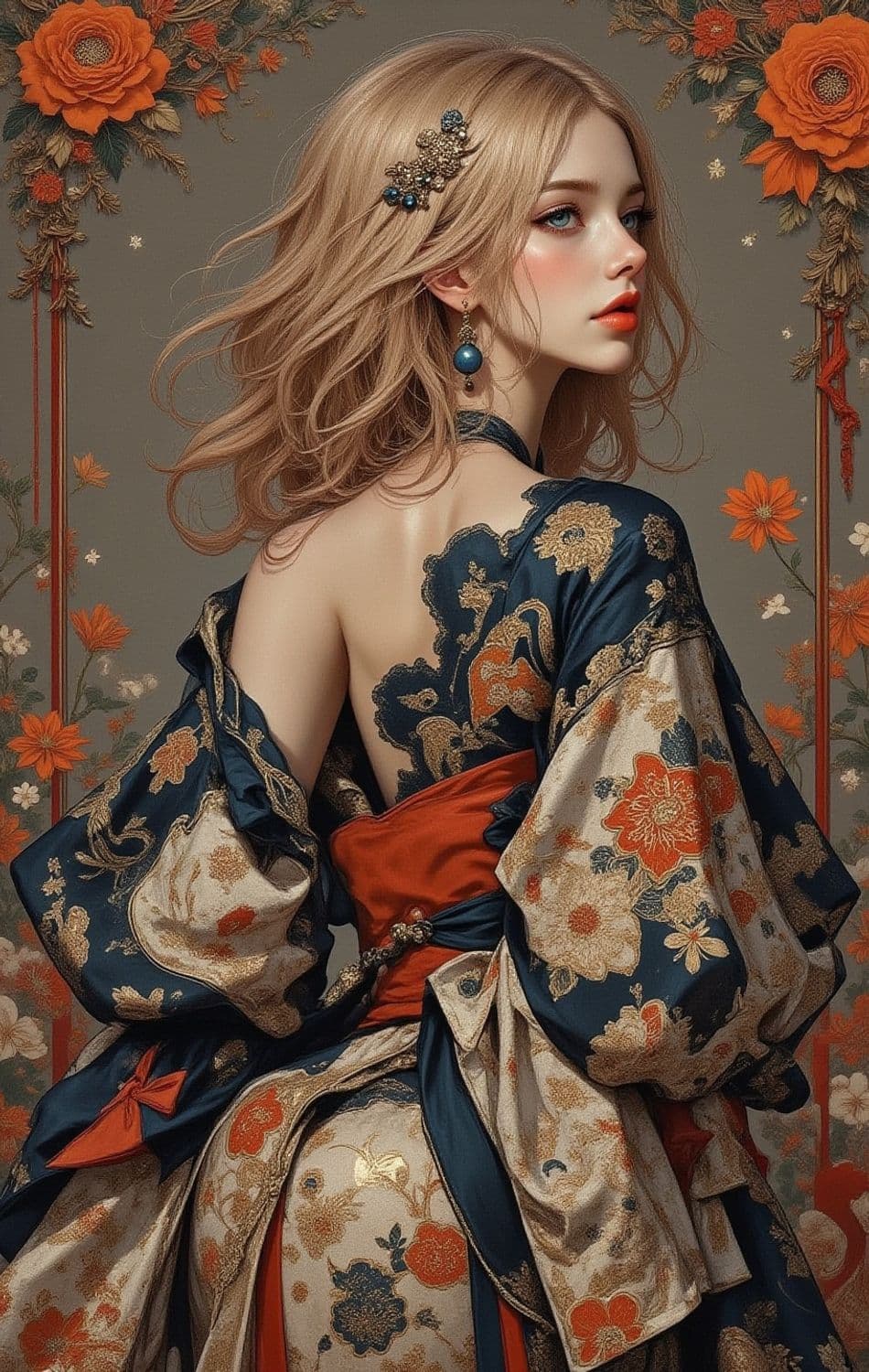 A captivating image of a young woman with long, flowing blonde hair adorned with an elegant headpiece. She wears a richly decorated garment featuring intricate floral patterns in shades of blue, orange, and gold. The background is embellished with matching floral designs, creating a harmonious and ornate aesthetic.